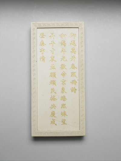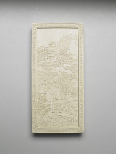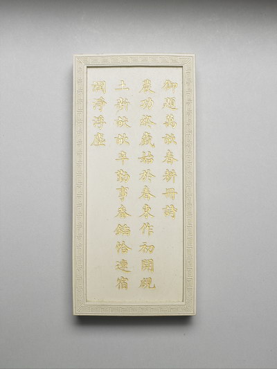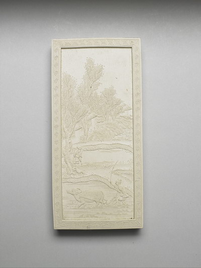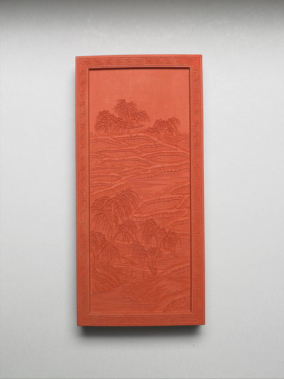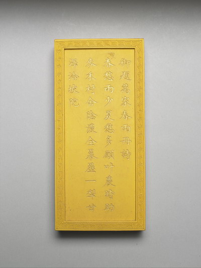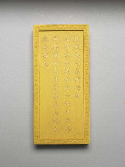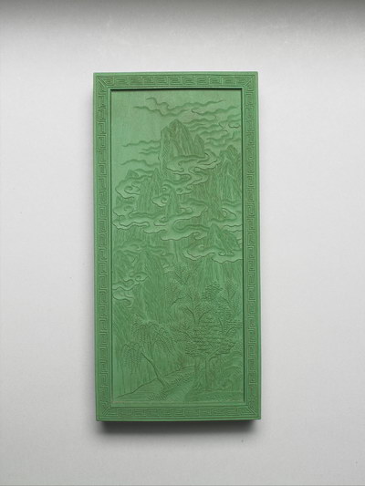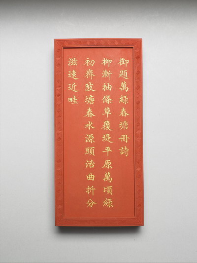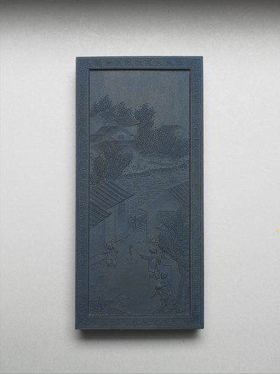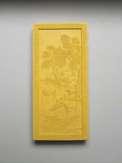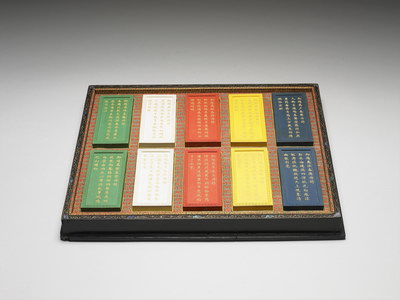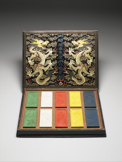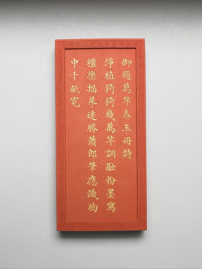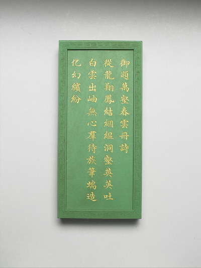 全册共十开,以 “万”、“春” 为题名,依次为:万户春声、万绿春塘、万家春雨、万亩春耕、万壑春云、万派春涛、万竿春玉、万屯春牧、万井春熙、万峰春霭。每幅均有清嘉庆帝题诗。并附画册同名五色画锭。