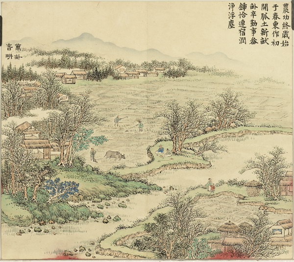 農功終歲始于春,東作初開胍土新。畎畝辛勤事畚鍤,恰連宿潤淨浮塵。