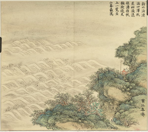 新水淪漣滿四澤,桃花初漲漾銀濤。掛帆擬欲遊天上,一覽尖山峰最高。