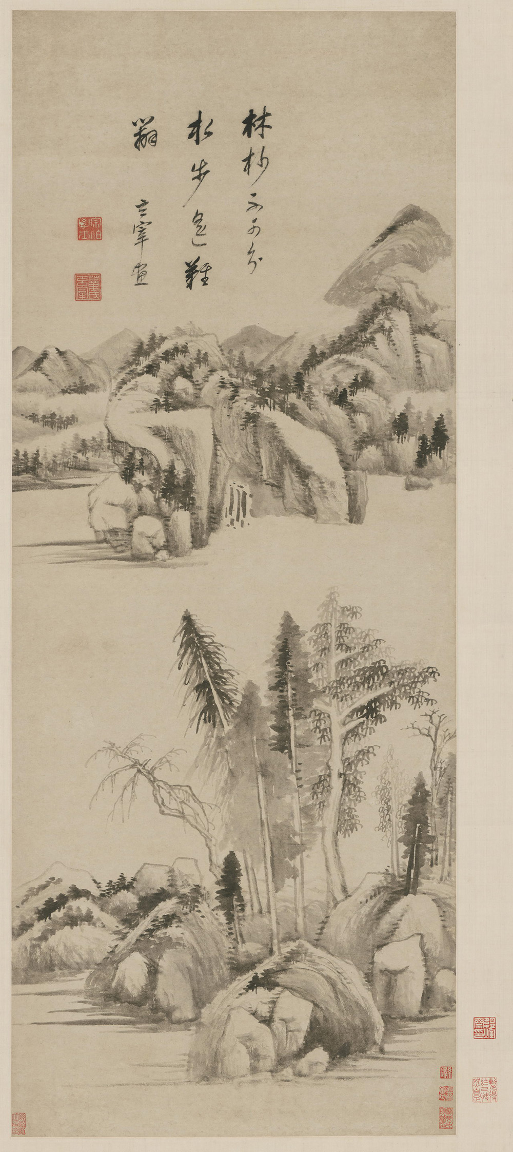 图中疏林坡渚,江水平缓,谷壑幽深,山色森郁。题“林杪不可分,水步遥难辨。玄宰画”,钤“宗伯学士”白文方印、“董氏玄宰”白文方印。另钤鉴藏印:“希逸”白文方印、“虚斋审定”白文方印、“庞莱臣珍藏印”朱文长方印、“孙煜峰珍藏印”朱文长方印。右裱边钤“韫辉斋印”白文方印、“暂得于己快然自足”朱文方印。