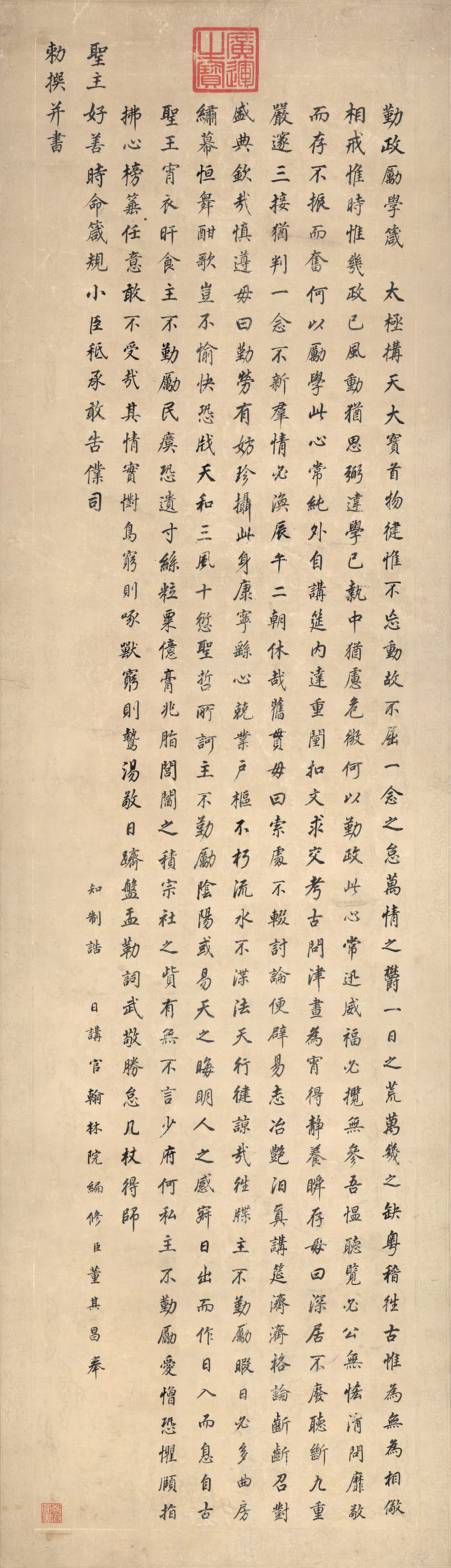 董其昌书法创作以行草最多,造诣最高,然其楷书造诣颇深、具相当功力。此卷是其楷书中的精湛之作,传达出淡雅萧散的逸韵。全作自首迄末,无一破体,取法颜真卿,用笔庄敬,圆劲秀逸,肥瘦适中,神完气足。行笔运腕,点划之间,略呈“拙”趣,又蕴含董氏自家书法风范,从中可以品味到成熟颜体结体宽绰、雍容大度的富态之美。款署:知制诰,日讲官翰林院编修臣董其昌奉敕撰并书。