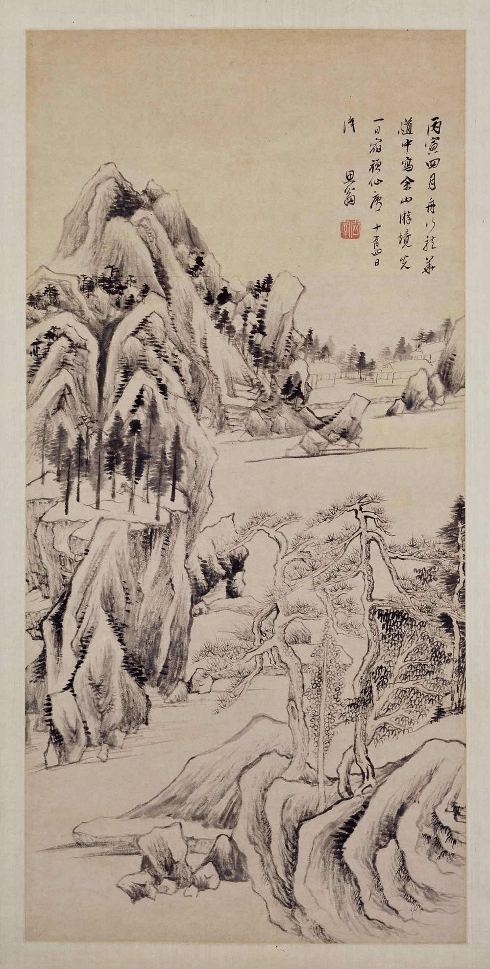 本幅自题:“丙寅四月,舟行龙华道中,写佘山游境。先一日宿顽仙庐。十有四日识。思翁。”钤“玄宰”印。