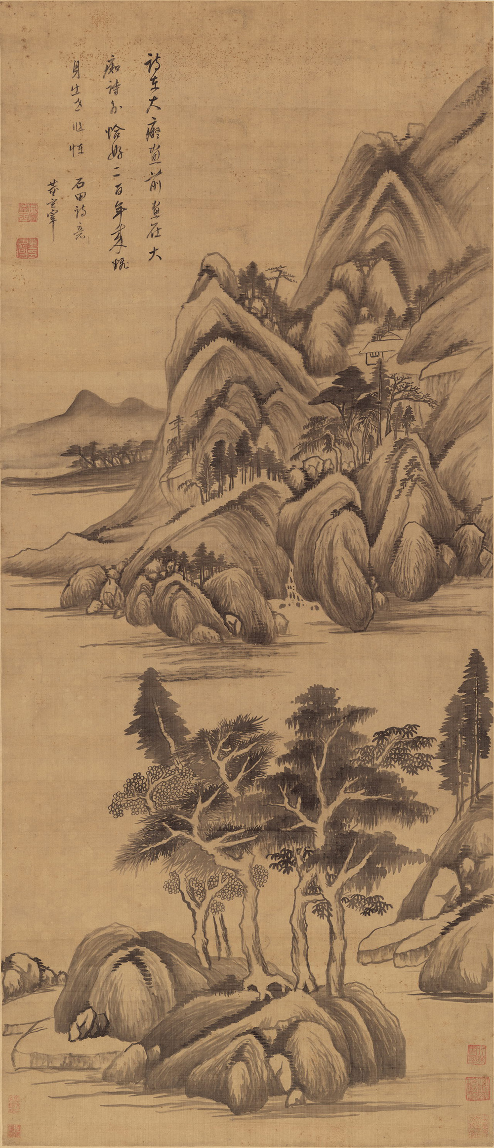仿黄公望笔法,得水墨淋漓之致。题曰:诗在大痴(黄公望)画前,画在大痴诗外。恰好二百年来,翻身出来作怪。石田诗意,董玄宰 。作者印:宫詹学士、董其昌印。