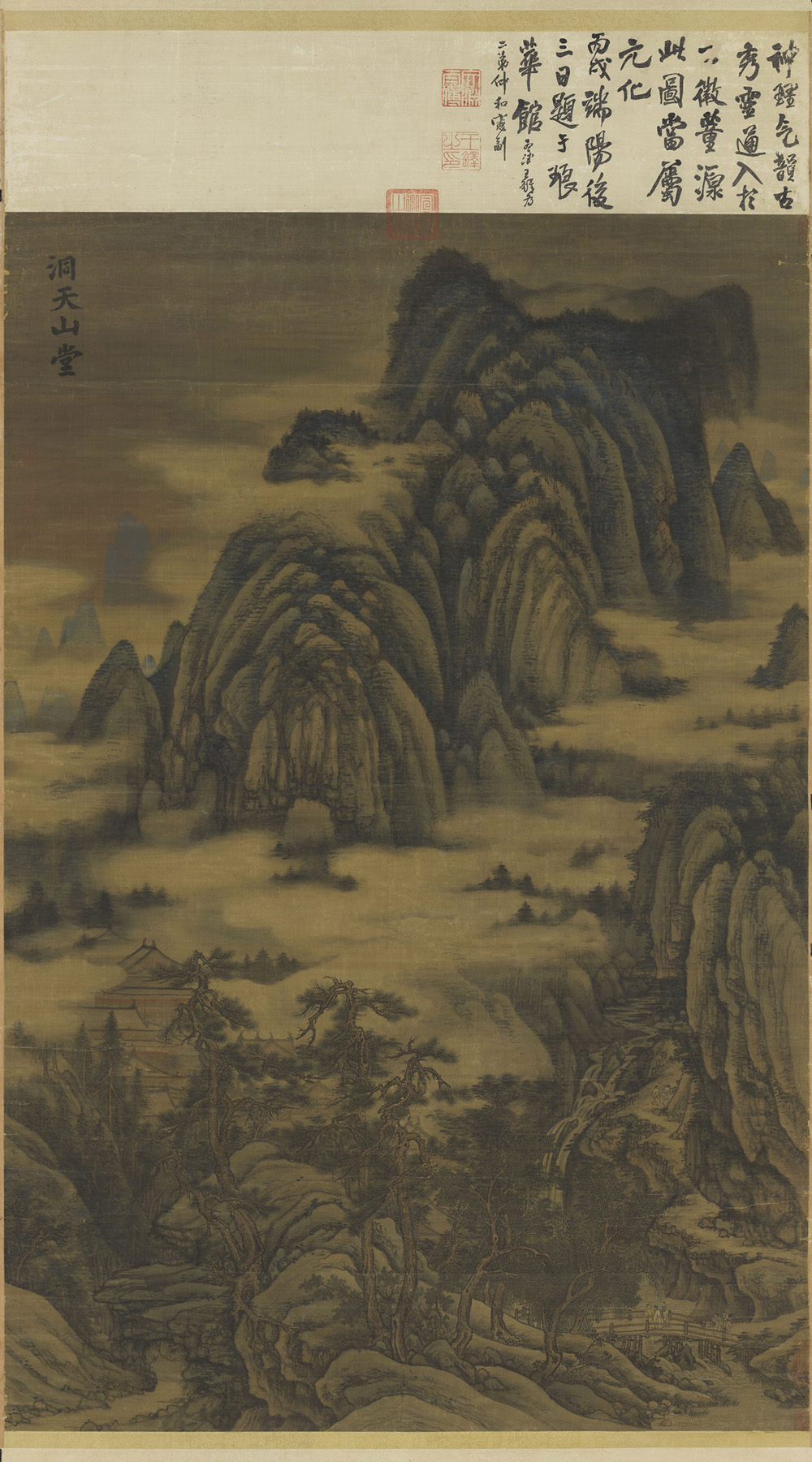 此幅描绘巨壑深沟,白云围绕,长皴短点相间以状写山石,复以浓墨敷染,更显浑雄苍郁,颇有撼人之势;左侧殿宇耸立,右边曲涧迤逦,山间行旅或赶路或临桥听泉,景致幽深雅静,点出世外仙境的主题。本幅无款,依王铎的题跋将作者定为董源。从笔意观之,此作成画时间约在元代。