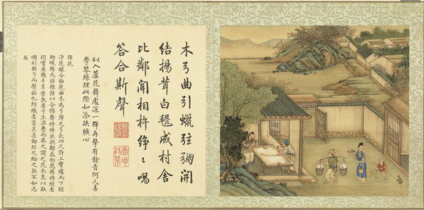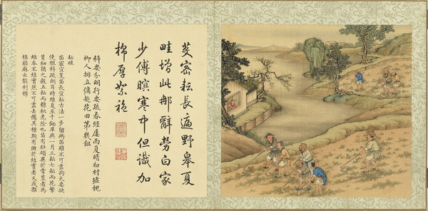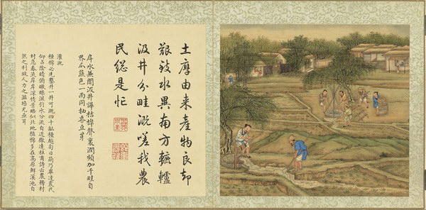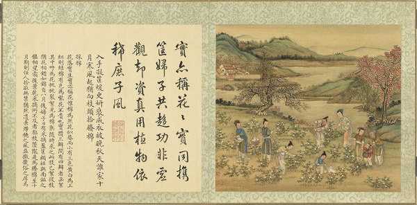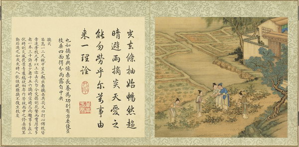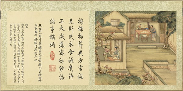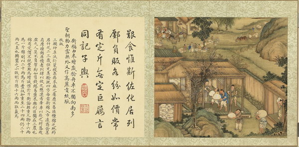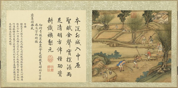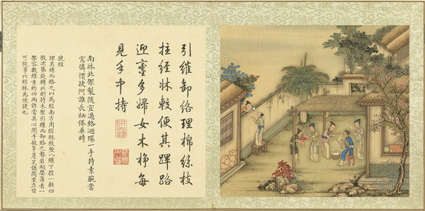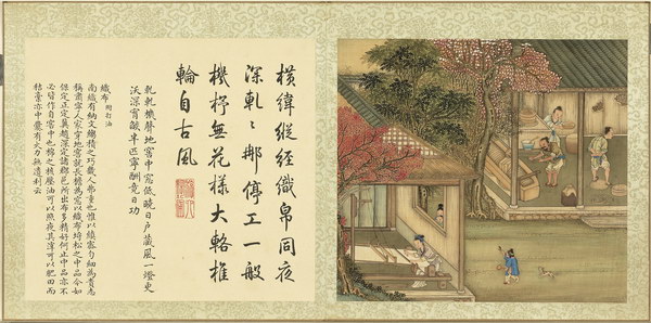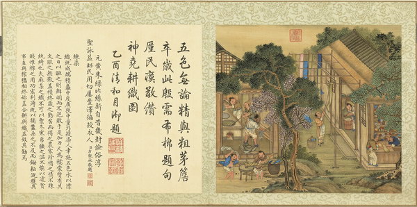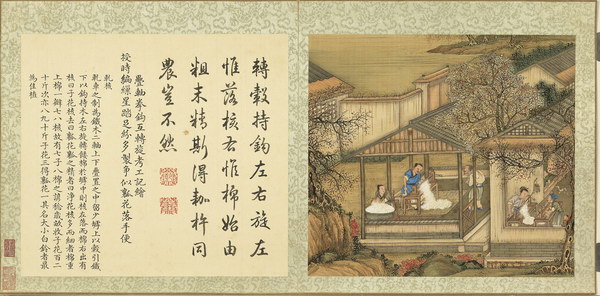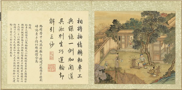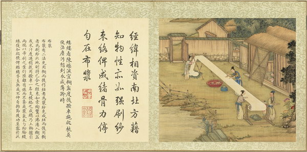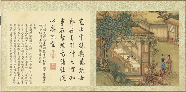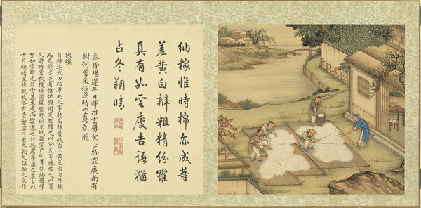 描绘从植棉到织染成布的流程,依次为:布种、灌溉、耕畦、摘尖、采棉、炼晒、收贩、轧核、弹花、拘节、纺线、挽经、布浆、上机、织布、练染,每图都配有文字说明和乾隆题诗。此为清乾隆时期绘本。