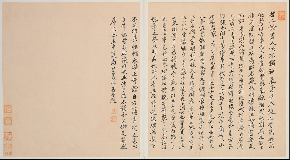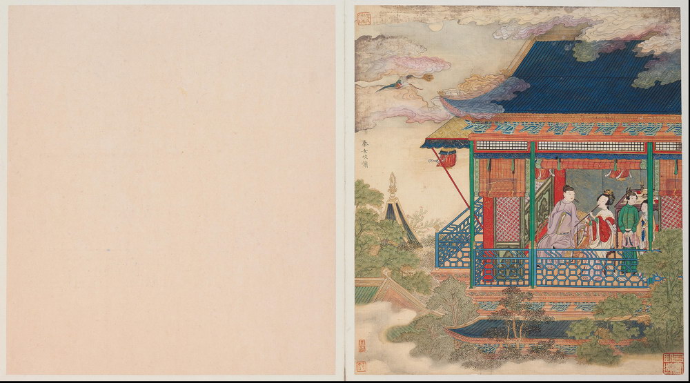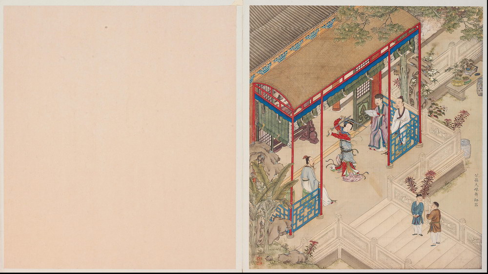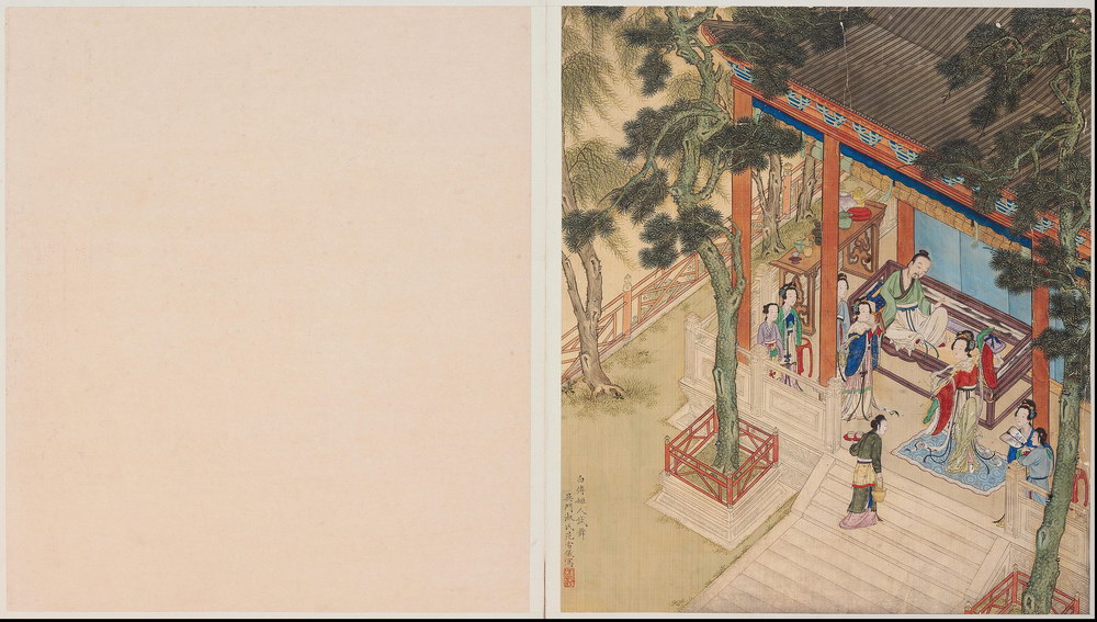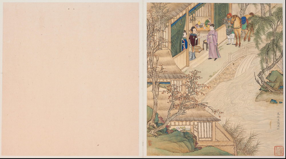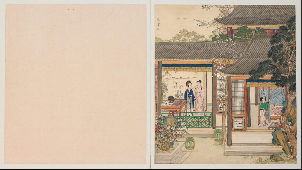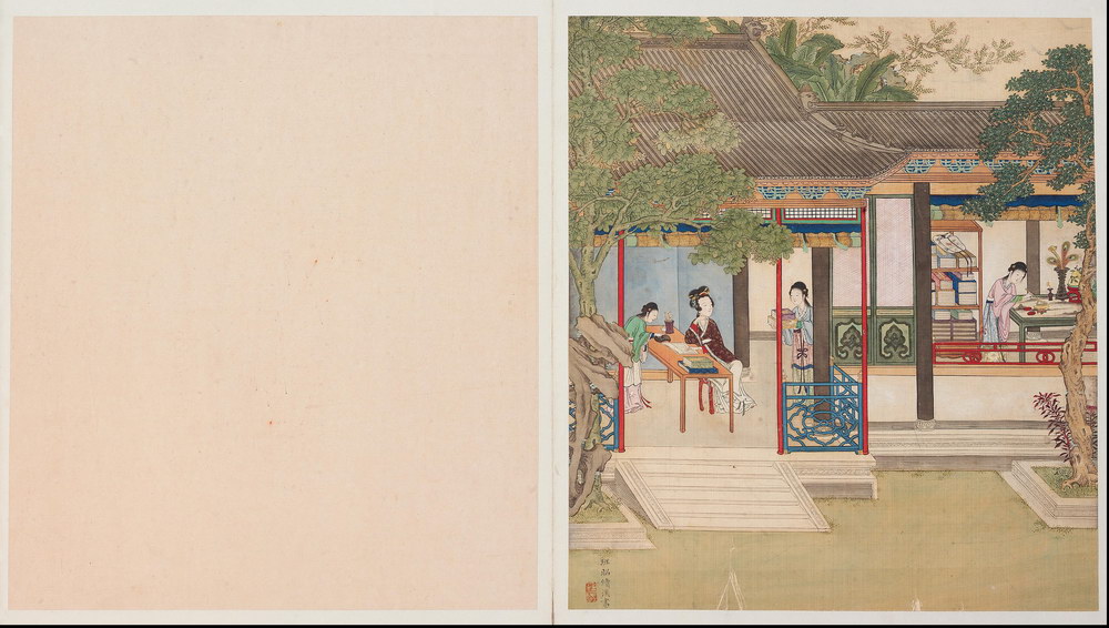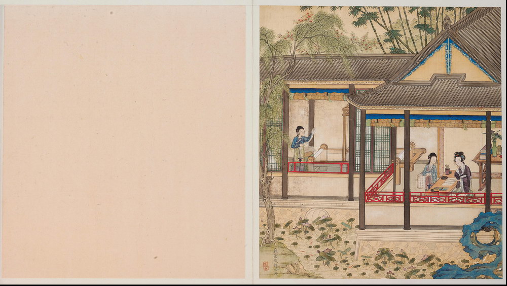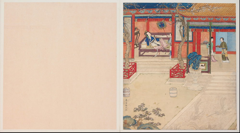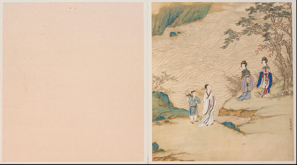 此图册为女画家范雪仪代表作。她以工笔重彩绘十个与女性有关的故事,所绘女子皆八字眉,细长眼,樱桃口,衣饰华美精致。作者:范雪仪,活动于康熙年间,江苏苏州人,为吴郡女性画家翘楚,善画人物。