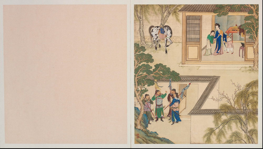 第六开:北朝民歌《木兰诗》讲述了木兰女扮男装,替父从军的故事。图绘木兰准备离家而去,弟、妹牵衣,不舍分别。