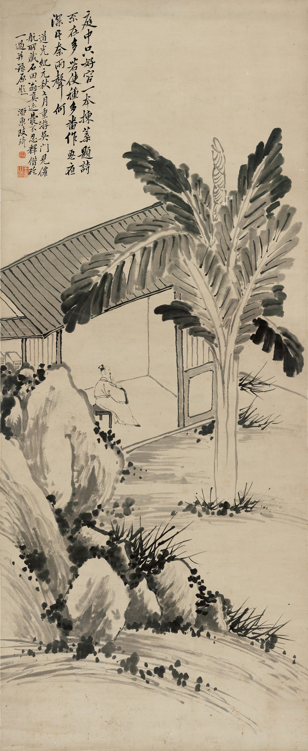 图绘一处厅子,一人坐于其中,厅前左侧山石耸立,正前一棵芭蕉树枝粗叶大,长势茂盛。