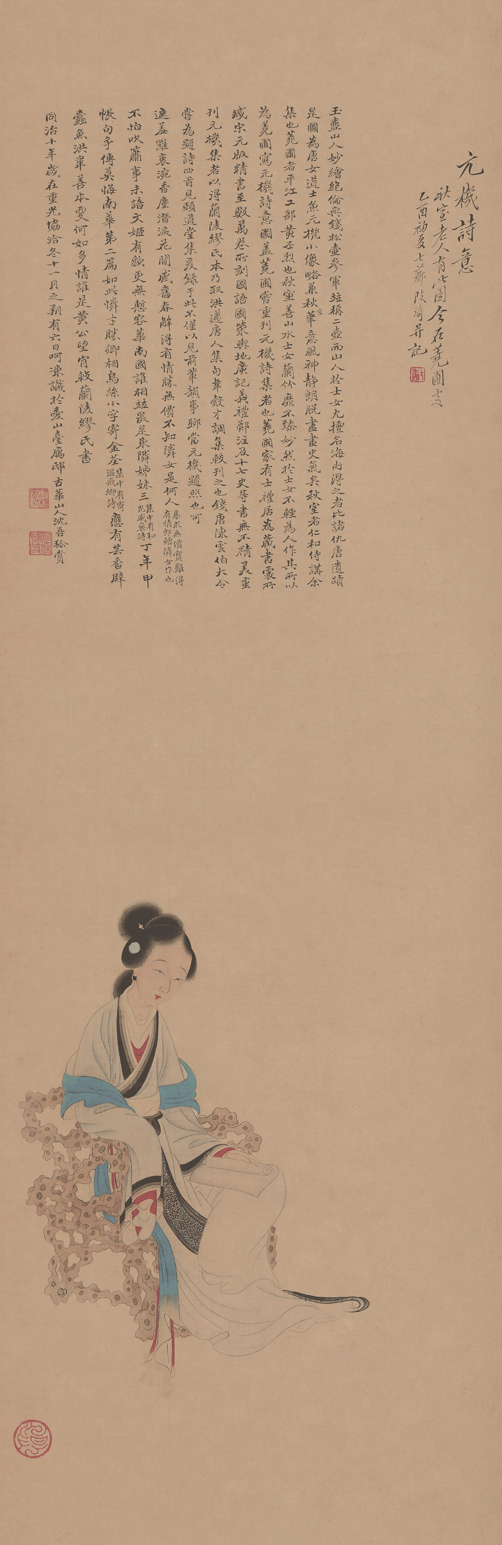 图绘鱼元机手展诗卷、侧身坐于藤瘿椅上的情景。她身单体薄,面容憔悴,双目中隐隐流露出一丝矜持凄凉的怨情,这正是清代文人画家所刻意追求的女性“清淑静逸”之趣。本幅款题“元机诗意,秋室老人有此图,今在荛圃处。乙酉初夏,七芗改琦并记。”钤“七香”、“云阳”2印。画幅左上方有清沈吾于同治十年(1871年)的题识,文中介绍了余集为黄荛圃绘制《元机诗意图》的由来。题识下钤印两方:“沈梧审定”、“旭庭秘笈”。