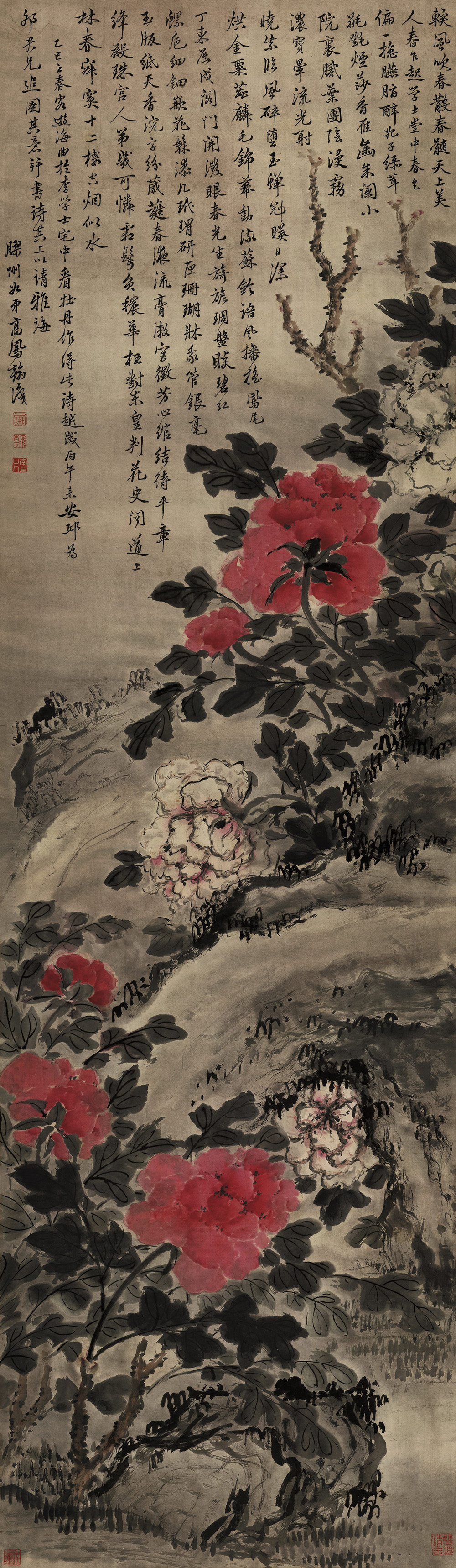 此图中牡丹、玉兰、海棠、杜鹃,布满全幅,最后还用石青衬底。牡丹敷以淡粉,用重粉点染边缘,显得晶莹剔透、庄重典雅。整个画面热烈为而秀雅,韵味十足。
