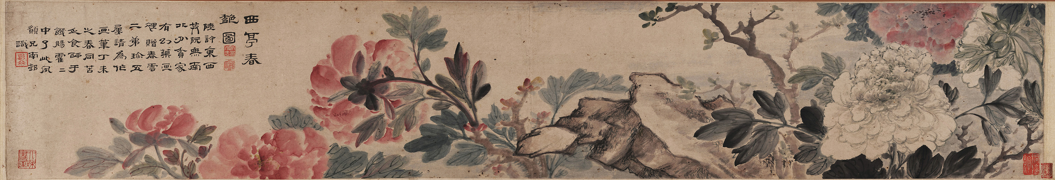 长卷绘红、白牡丹数朵,粉色娇嫩妖娆,千姿百态,白色花朵花瓣层层叠叠,端庄大方;花中配以石块、绿树,流露出春的气息。技法上,粉色花瓣以淡粉晕染,白色以淡绿勾勒花瓣轮廓,花叶以墨绿晕染,再以深绿细线勾勒叶脉。