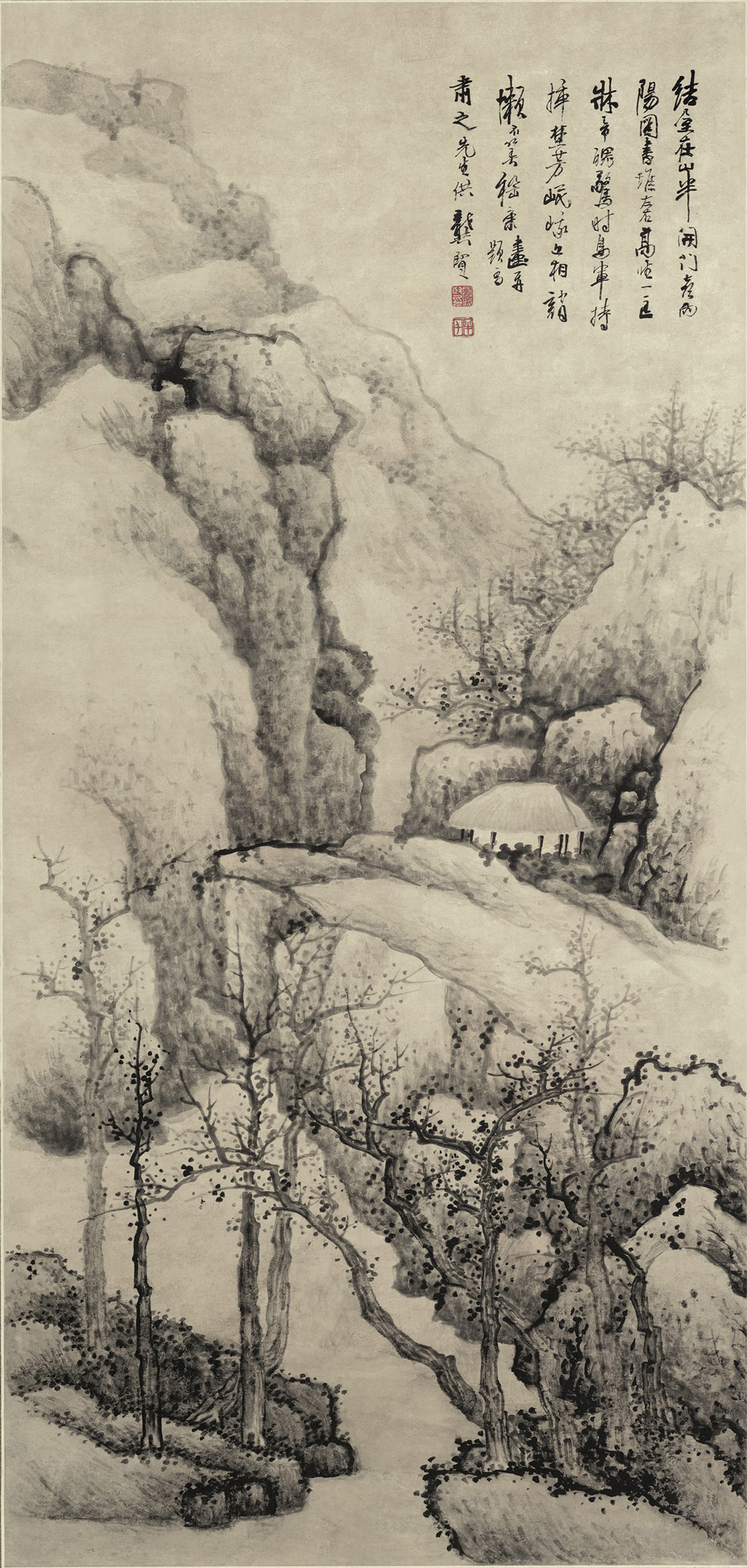 款识:结屋在山半,开门喜向阳,图书堆左右,高睡一匡床。帝魄惊时鸟,军持插楚芳,岷峨近相诮,懒不弄嵇康。画并题为肃之先生供,龚贤。