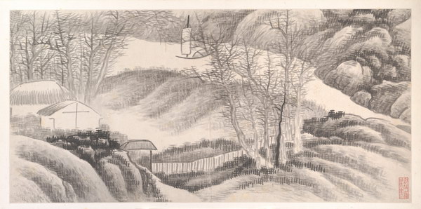 表现了错落有致的田间小景、树木、山石与房屋,画家利用平面构成分割了前景、中景、远景三个层次,又利用树丛的的生长方向所形成的线,小屋与船只形成的点状,山石、水岸所构成的大块面积的面组织画面关系,把自然物象转化为抽象的点、线、面加以组合使画面丰富而又有节奏感。