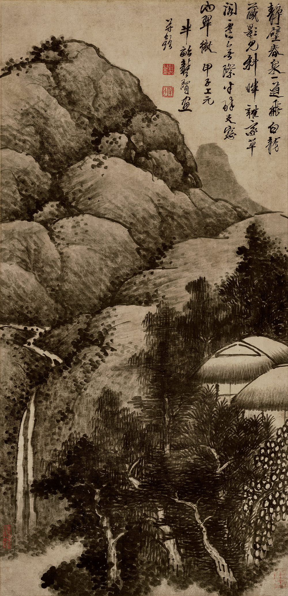 画面描绘了近景崇山,山上有丛林、枝繁叶茂,几间茅庵掩映于树丛之中,使得寂静的山林更增添了几分幽邃之感,清清的泉水顺山而下,明快、幽雅、整幅画面笔酣墨润、气韵即足,给人一种清新自然之感。作者运用了“披麻皴”“雨点皴”等画法,虽不用泼墨,湿墨,但有泼墨之淋漓,浓郁苍润的效果。代表了作者山水画之独特风格。画的右上角有作者自题七言律诗: “静壁春泉一道飞,白龙藏影见斜辉,谁家草阁遥无际,半醉之窗向翠微。”署 “甲子上元(1684年1月15日)半亩龚贤书并题”款。下钤“龚贤印”白文方印,“半千”朱文方印。画上钤有“绶福堂藏画印”等鉴藏印。
