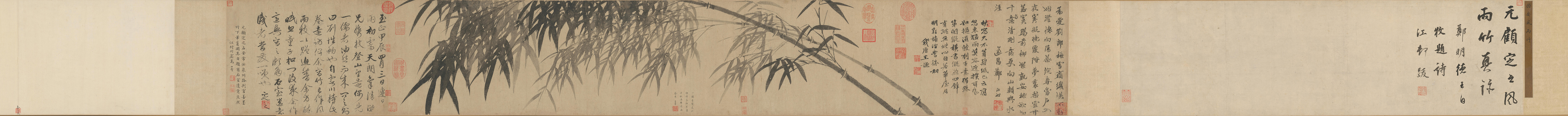 此图为画家暮年墨竹名作。以浓淡墨笔画大叶竹两竿,枝干斜覆,竹叶下垂,表现了风雨中竹子的枝叶挂满雨水、纵横披离、摇曳多姿的自然形态。用笔潇洒苍润,墨气浓重,严谨自然,劲挺有骨,悉尽笔墨之能事,清润之气扑人眉睫。