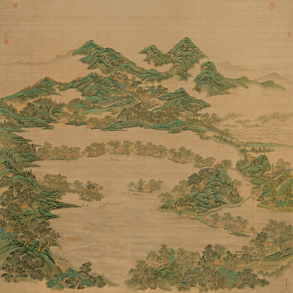 绘西湖的景致,层峦迭翠,秀丽雅致,佐以茂密的松柳植栽,悠然盘绕于山间的云雾,让人心情为之豁然开朗。