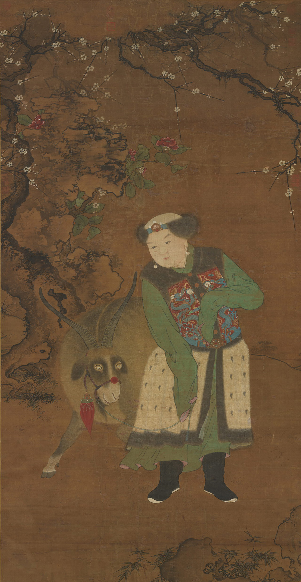 本幅描绘一牵著羊的孩童,站在盛开的梅树下。画中山茶花与梅花均为正月之花,寓意新年,而 “羊” 通 “祥”,因此整幅画有新年吉祥之意。 图中孩童衣著华丽,很多服饰的细节都与北京出土明定陵皇家用物如出一辙,例如,腰间镶有红、蓝、白宝石的金带饰、圆珠形玉耳墬、及胸前五爪双龙绣补等。其中五爪双龙绣补更暗示画中孩童应为皇子之类的皇家成员。 背景湖石以近似郭熙云头皴的作法描绘,有学者推论可能为活跃于十六世纪上半之宫廷画家朱端所补景。