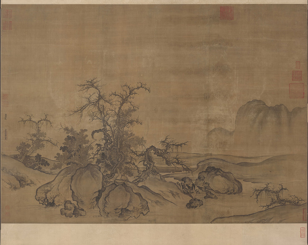 画面近景,溪水清浅,岸边岩石裸露,石上杂树一丛,枝干蟠曲,有的叶落殆尽,有的画出老叶,用淡墨渲染。远处,寒烟苍翠,荒原莽莽,群山横列如屏障,天空清旷无尘,是一派深秋的景象。