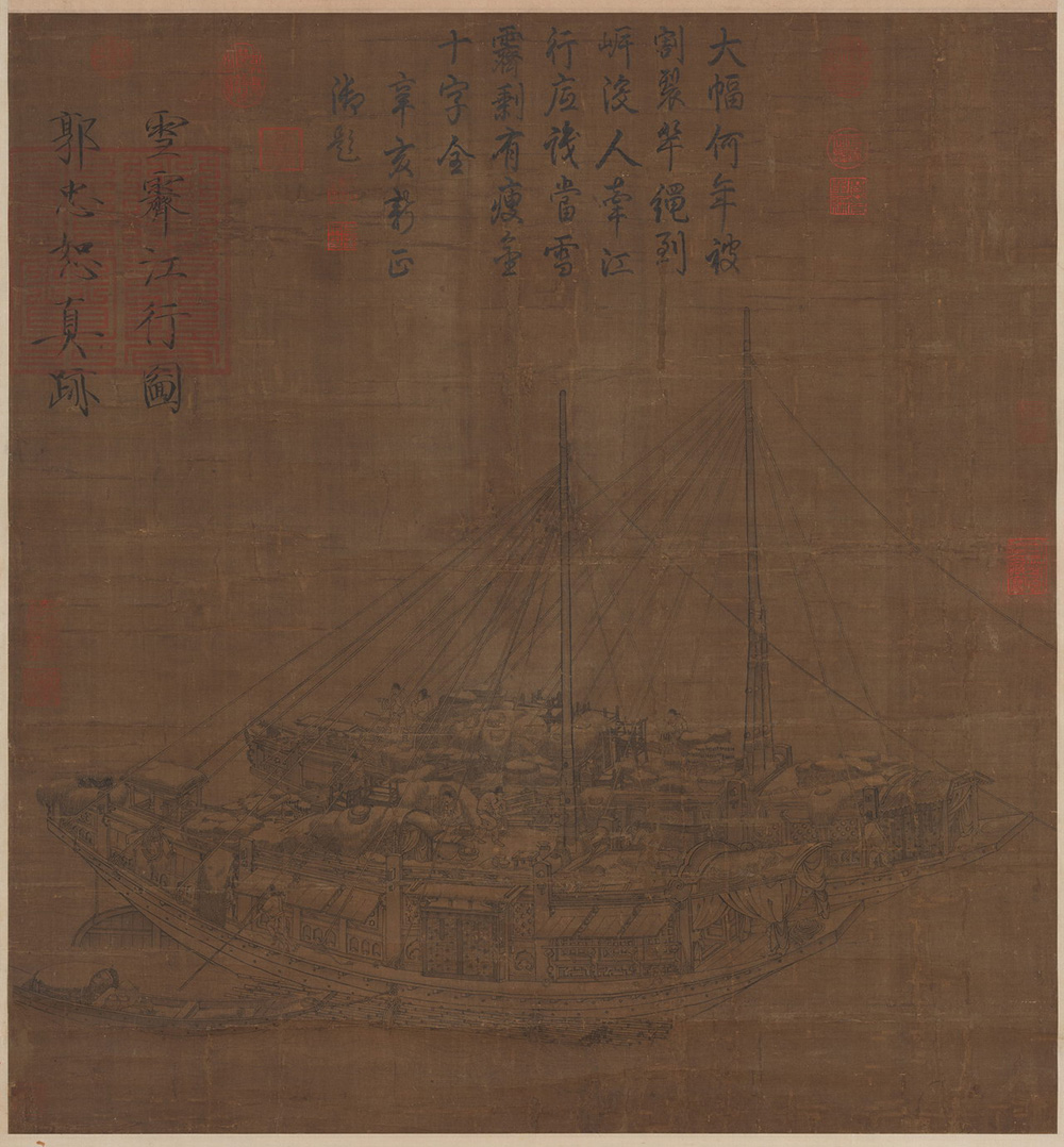 一般所谓的“界画”都在画殿阁舟船等结构複杂的对象,画法上则以细緻而控制严谨的线条作为其特徵。它之成为正式画科,发生在北宋,而郭忠恕则是第一位被提到的大师。此幅左侧宋徽宗书风的题识,即指郭忠恕为作者。 画中以两艘大船为主,桅杆上有两道向画外的牵绳,却不见牵夫,推测画幅曾受裁切。由桅杆及舵楼之细节表现精准来看,画家确为明瞭船舶结构的专家。而由船伕与仕女的活动中,又另点出船主与官方的可能关联。船的正侧面表现特显古朴,至十一、十二世纪后,就少见这种画法了。