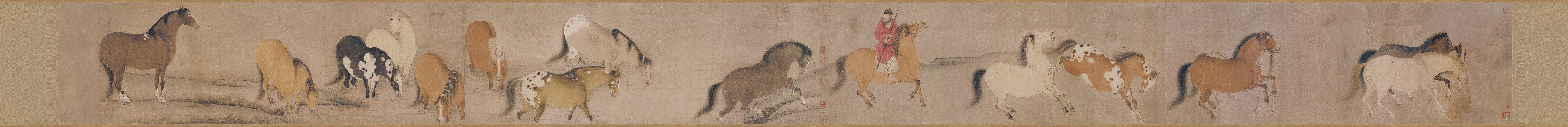 绘十六匹马,匹匹生动,形神各异,如最后一匹,似为马群之首领,高骏突出,神气轩昂,此十六马皆野外放牧之马。收传印:赵氏子昂(半印)、项墨林父秘笈之印、子京父印、祖孙父子兄弟翰林、墨林父、退密、臣和恭藏、君寔、蕉竹草堂、君寔过眼、庞志英、黄山涛鉴定。