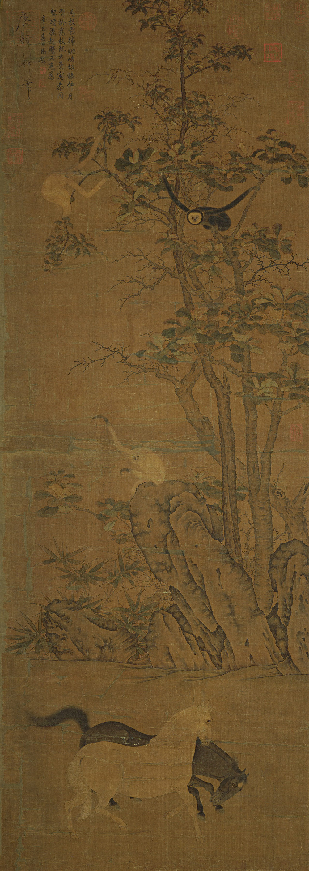 该幅无款,旧题唐代韩干作。此幅绘竹石树林,三猿戏於枝间石上,其下绘黑白双骏。画上宋徽宗题字和”御书”一玺,及理宗”缉熙殿宝”玺皆伪,当为后加。然画中不论猿、马、树石、枝叶,皆描绘细腻,或为南宋作品。