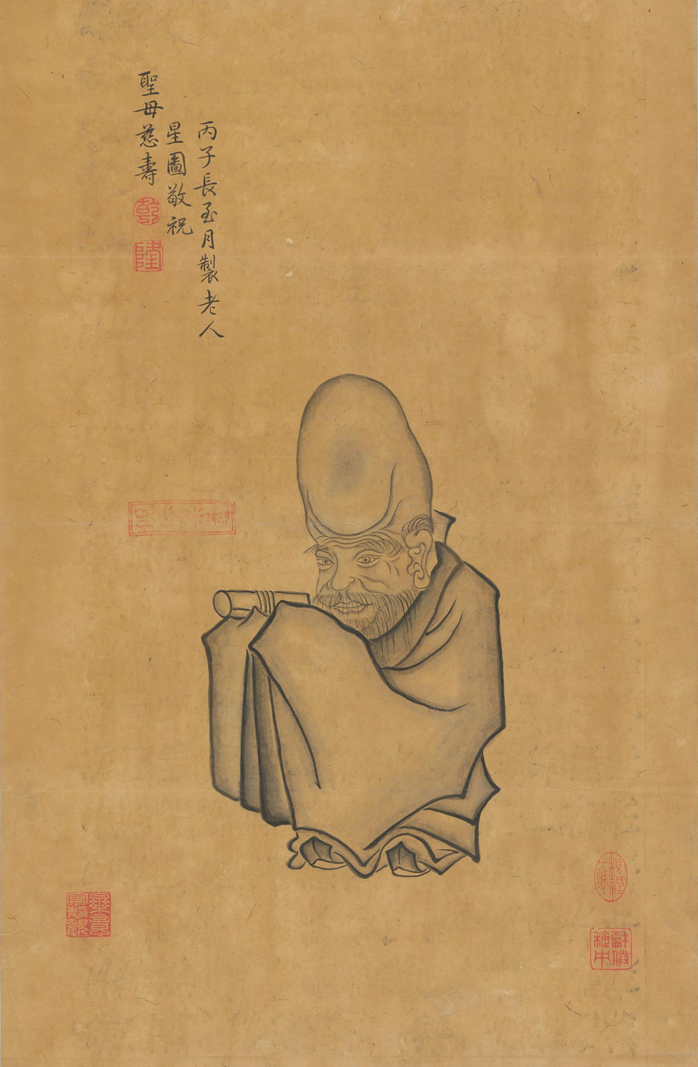 本幅有乾隆帝自识:“丙子长至月制老人星图,敬祝圣母慈寿。“钤“乾“朱圆、“隆”朱方印。本幅另有“乐意寓静观“白方、“根祇祇一诚“朱圆、“和顺积中“朱方印。此图为乾隆二士一年(1756年)皇帝为崇庆皇太后65岁生日绘制,敬祝其母长寿。图中所绘“老人星”,即寿星,多用于庆祝长者寿庆。该图绘于倪仁禀纸,此纸属于藏经纸的一种,系清宫特制用纸,本幅中部钤有该纸印鉴。