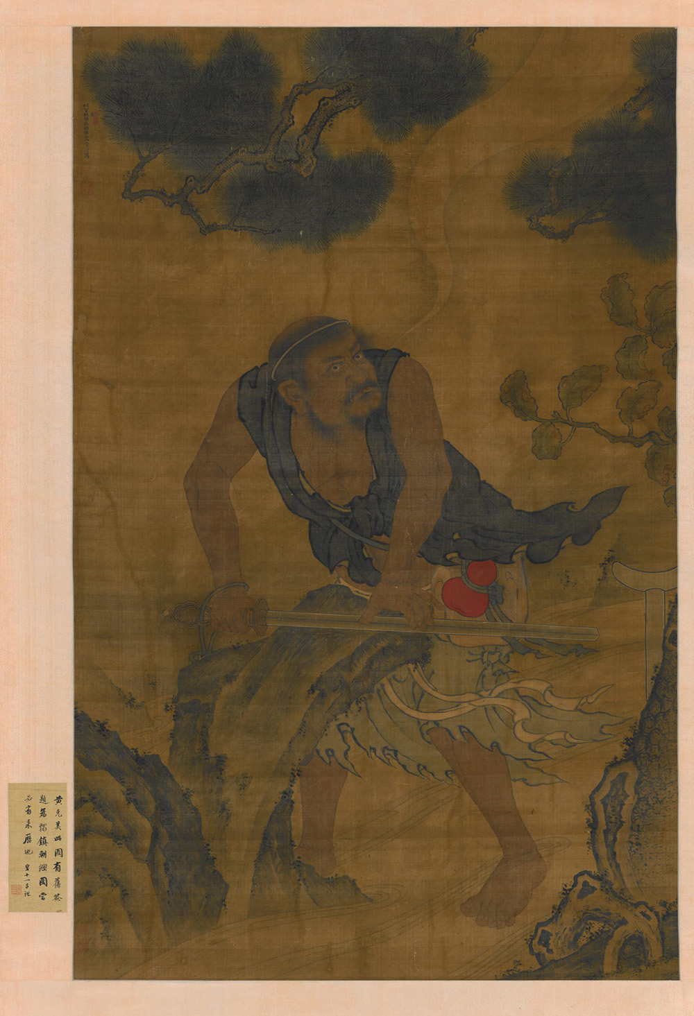 图绘八仙之一铁拐李腰挂葫芦,衣衫褴褛,赤足立于水中,双手挽宝剑,在石上磨砺。在衣纹的描写上,用工整流畅的铁线描和兰叶描,造型准确,个性鲜明,属于继承唐宋以来工笔传统工细人物画。整幅作品,用笔秀润,设色古雅,老松苍劲,岩石朴茂,人物生动传神,体现了画家在人物画和山水画上过人的艺术功力。