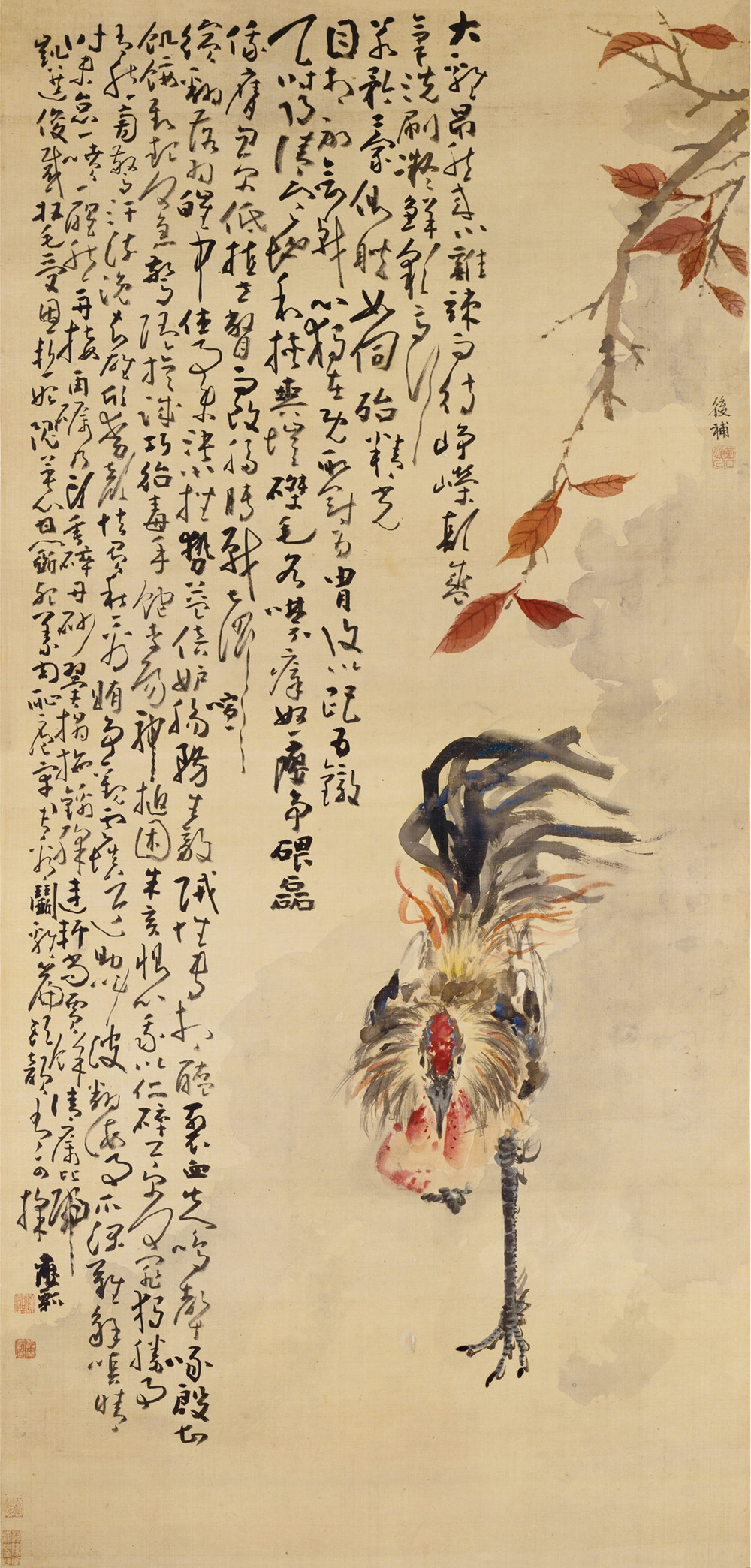 绘雄鸡单腿迈步,微张的羽毛,烈焰红冠,气势强劲,威风凛凛;右上角一枝杆斜入画中,零散的红叶附于枝上;画左侧有画家草书书法一篇,运笔枯劲,散而有序。