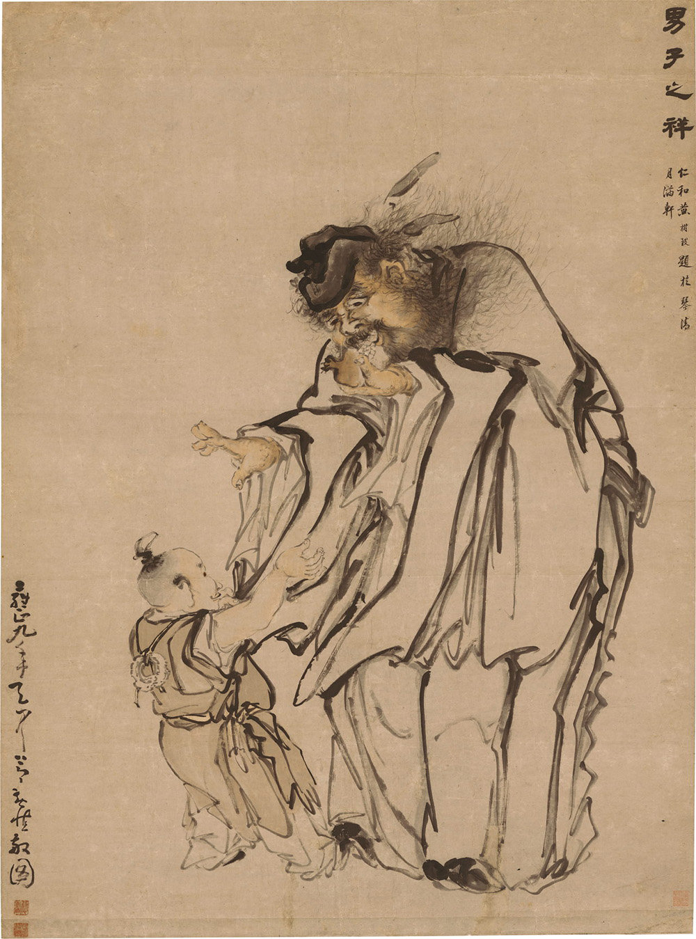 此幅绘钟馗吃石榴,一小童与其嬉戏。寓意多子多孙,应黄慎应人之嘱而画的吉祥画,用以鬻粥生活。