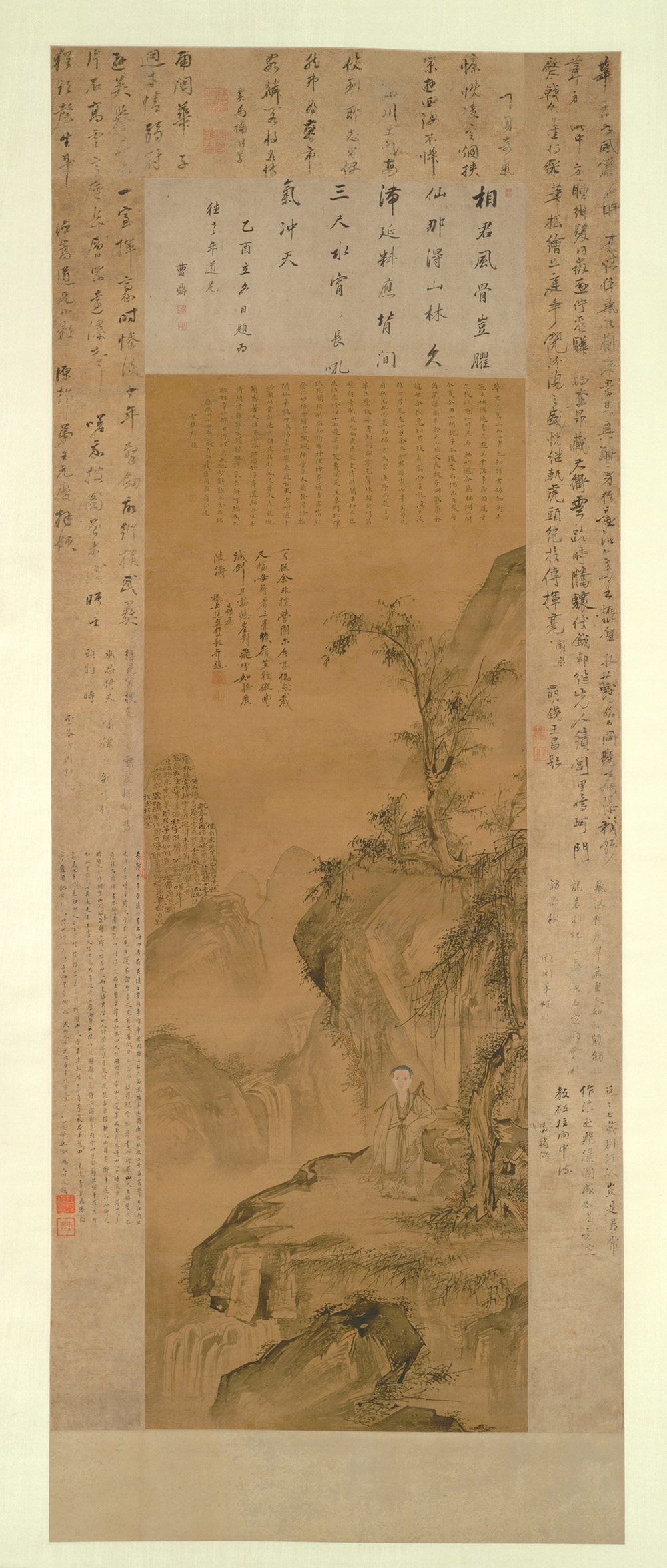 这幅肖像由魏世杰和华喦本人共同完成,他在背景中描绘了风景。此处显示的华喦大约 23 岁。他背上的剑是指他早年对军事生涯的渴望,而书生的长袍则暗示了对立的志向。这些都是复杂个性的标志。这幅画也揭示了华喦早期的绘画天赋。虽然魏世杰鲜为人知,但华喦后来成为了著名的画家。除了魏世杰和华喦,华喦同时代的九位朋友都在这幅画上留下了铭文。