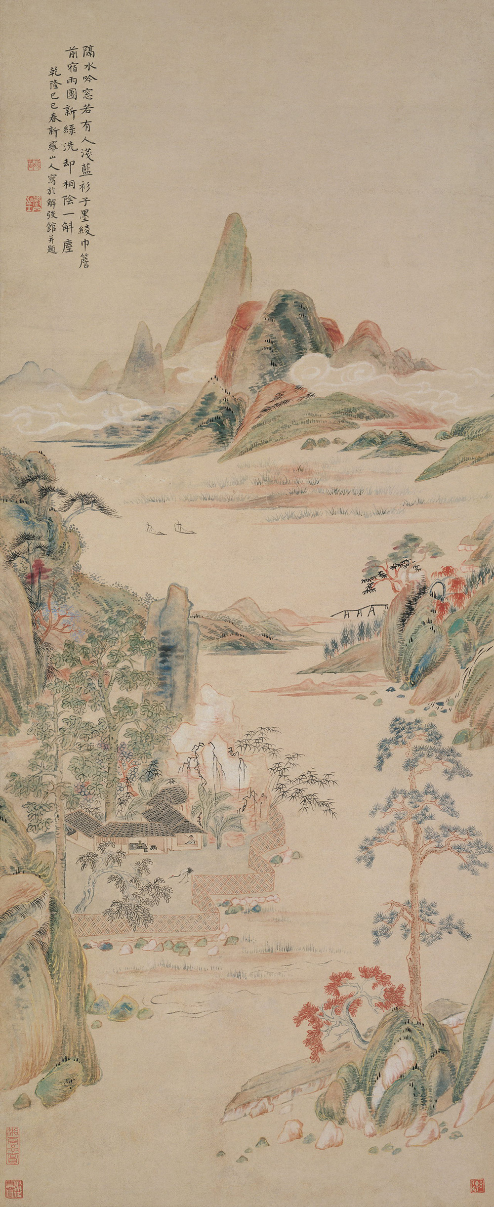 图中自题“隔水吟窗若有人,浅蓝衫子墨绫巾。檐前宿雨团新绿,洗却桐阴一斛尘。乾隆己巳春新罗山人写于解弢馆并题”。下钤“秋岳”朱文印,“岩穴之士”白文印。为作者六十八岁时所作。
