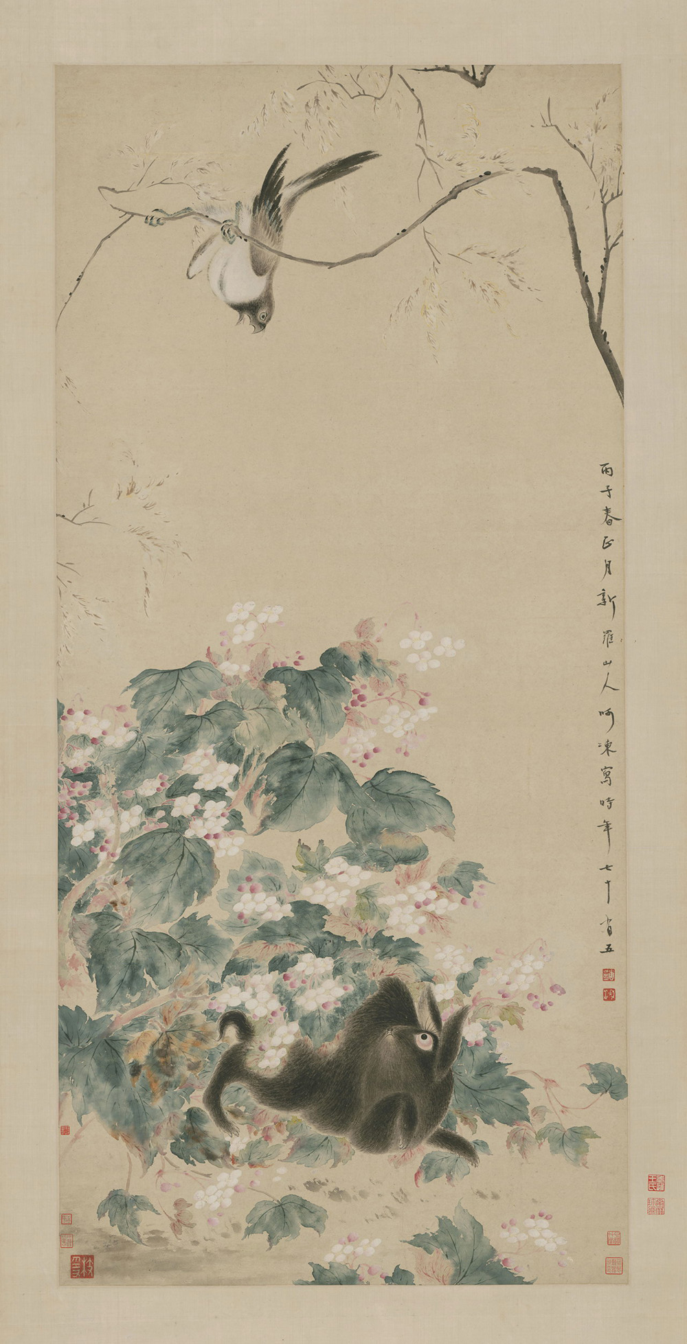 此图是他晚年的代表作,画家运用拟人化的手法,将鹦鹉按捺不住的欣喜和黑兔胆小好奇的神态表现得生动传神。