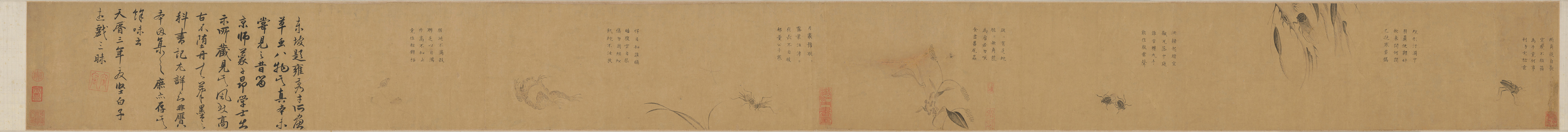 坚白子以苏轼《题雍秀才画草虫八物》诗为题材作画,画天水牛、蝉、蜣螂、蝎虎、促织、虾蟆、蜗牛七种草虫。