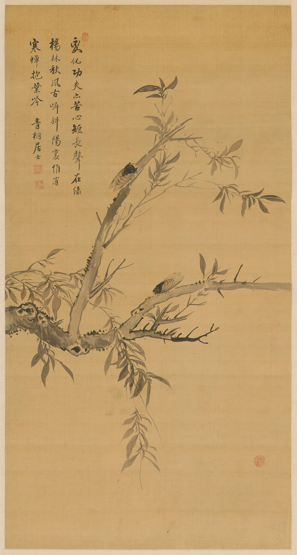 画面自题:“变化功夫亦苦心,短长声在绿杨林。秋风古岸斜阳里,惟有寒蝉抱叶吟。青桐居士。”钤“漱玉”朱文印、“青桐居士”朱文印、“蒋廷锡印”朱文印、“妙与道俱”朱文印。此图以水墨画柳枝柳叶,一对寒蝉栖枝而鸣。画家用笔轻灵,墨色浓淡变化丰富,具象写实。蝉的幼虫生活在地下土穴中,蜕壳后生出蝉翼,再飞上枝头。古人认为蝉居于树梢高处,餐风饮露,视蝉为高洁的象征,以此为诗画主题来暗喻自己的清白和理想抱负。