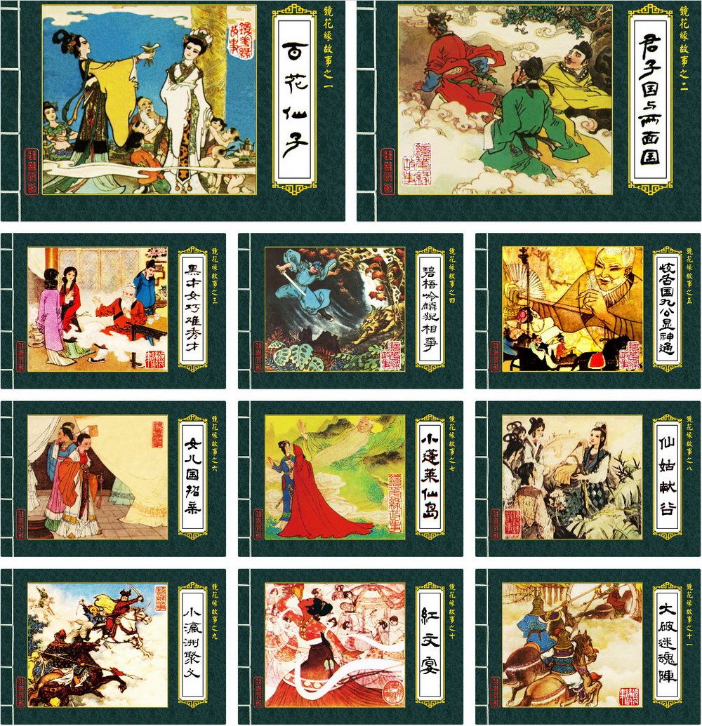 《闽版连环画典藏系列·镜花缘》包括《百花仙子》、《君子国与两面国》、《黑才女巧难秀才》、《碧梧岭麟猊相争》、《岐舌国九公显神通》、《女儿国招亲》、《小蓬莱仙岛》、《仙姑献谷》、《小瀛洲聚义》、《红文宴》、《大破迷魂阵》共十一册