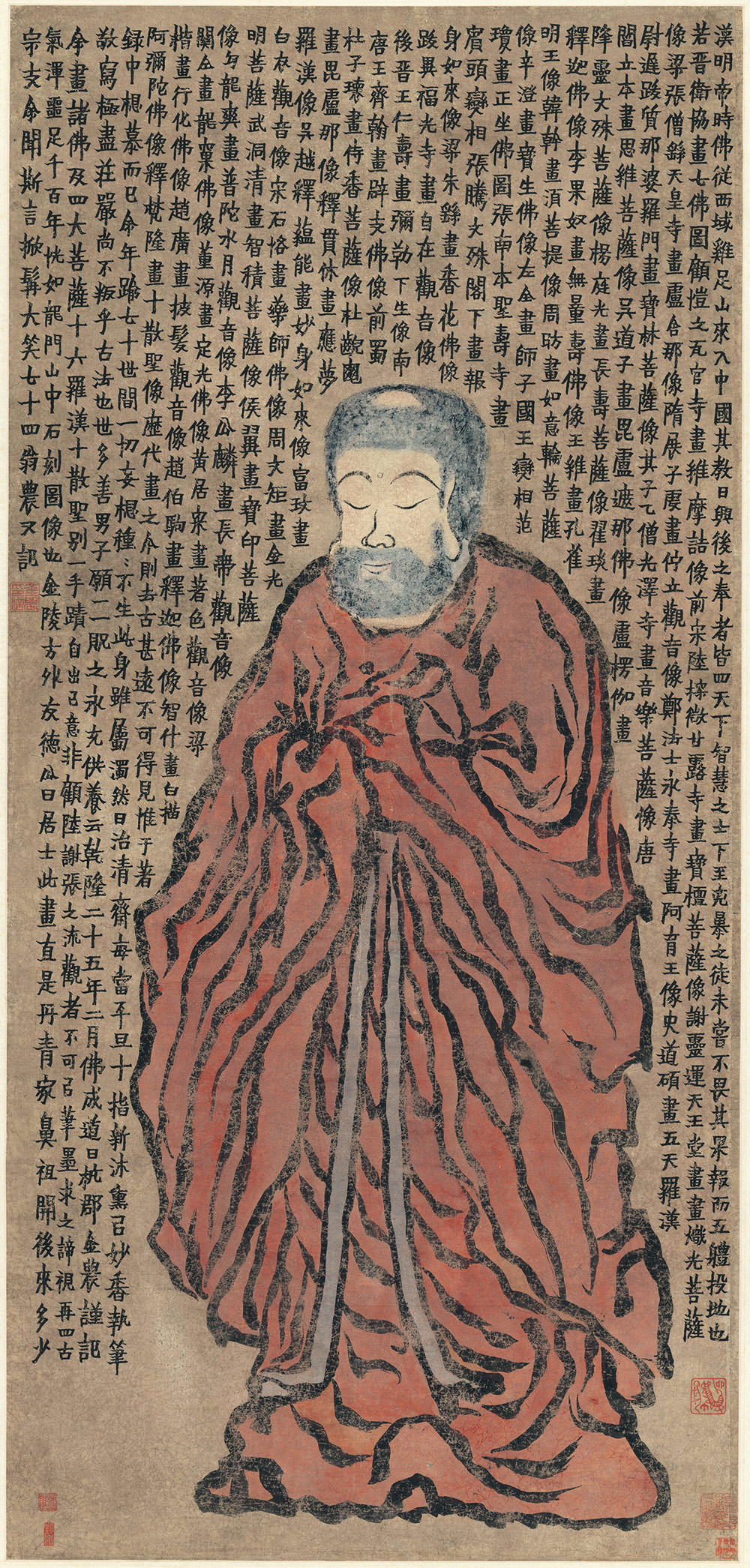 绘一佛身着红袍,浓须细眉,双目微闭,双手拱起,神态安详;环绕佛像四周写满金农式漆书体之字,所写内容讲述佛像从西域传入中国后,著录中见到历代名家所绘佛像,以及自己对其所绘的佛像进行评论。