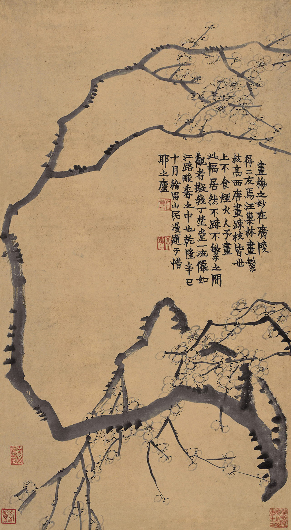 款识:梅之妙在广陵,得二友焉,汪巢林画繁枝,高西唐画疏枝,皆是世上不食烟火人。予画此幅,居然不疏不繁之间,观者拟我丁野堂一流,俨如在江路酸香中也。乾隆辛巳十月稽留山民漫题于惜耶之庐。