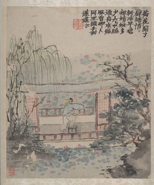 款识:荷花开了,银塘悄悄,新凉早,碧翅蜻蜓多少?六六水窗通,扇底微风。曾那人同坐,纤手剥莲蓬。记。