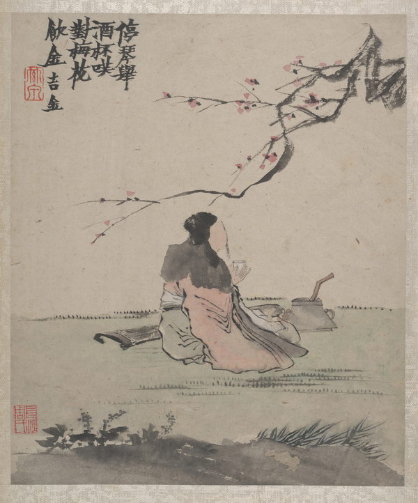 款识:停琴举杯,叹对梅花饮。金吉金。
