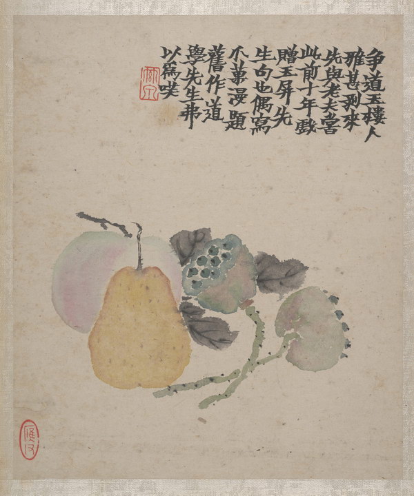款识:争道玉楼人雅甚,剥来先与老夫尝。此前十年戏赠玉屏先生句也,偶写瓜果漫题旧作,道学先生弗以为叹。