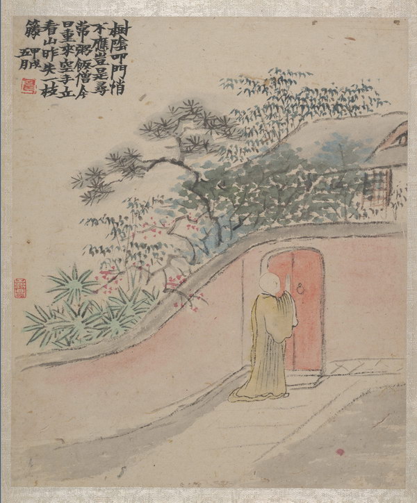 款识:树阴叩门悄不应,岂是寻常粥饮僧。今日重来空手立,看山昨失一枝藤。甲戌五月。