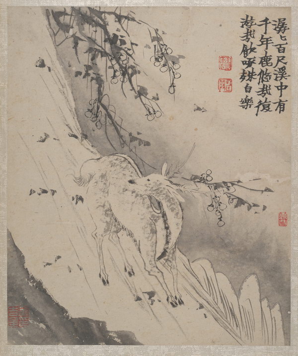 款识:潺潺百尺溪,中有千年鹿。悠哉复游哉,饮啄殊自乐。