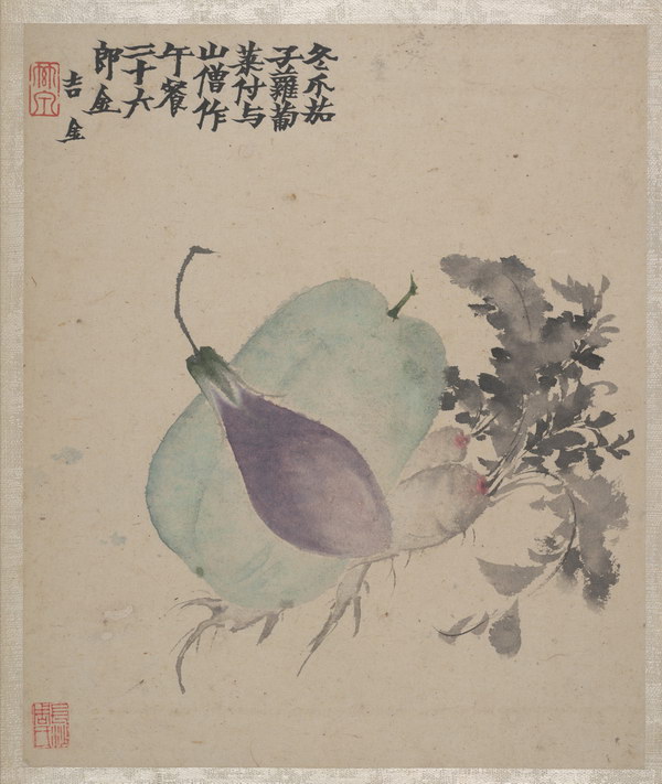 款识:冬瓜茄子萝葡菜,付与山僧作午餐。二十六郎金吉金。