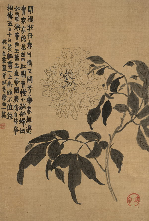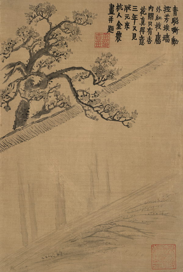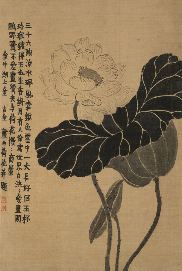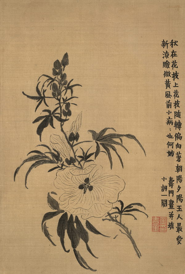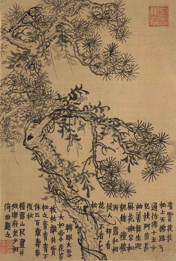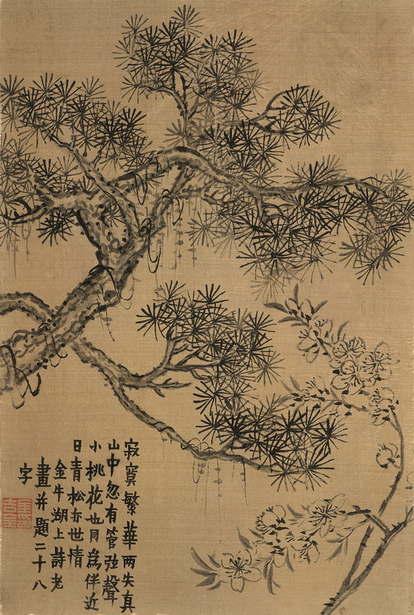 画面绘松树、梅花、荷花、海棠等不同植物,构图别致,随意挥写点染,简朴疏秀。