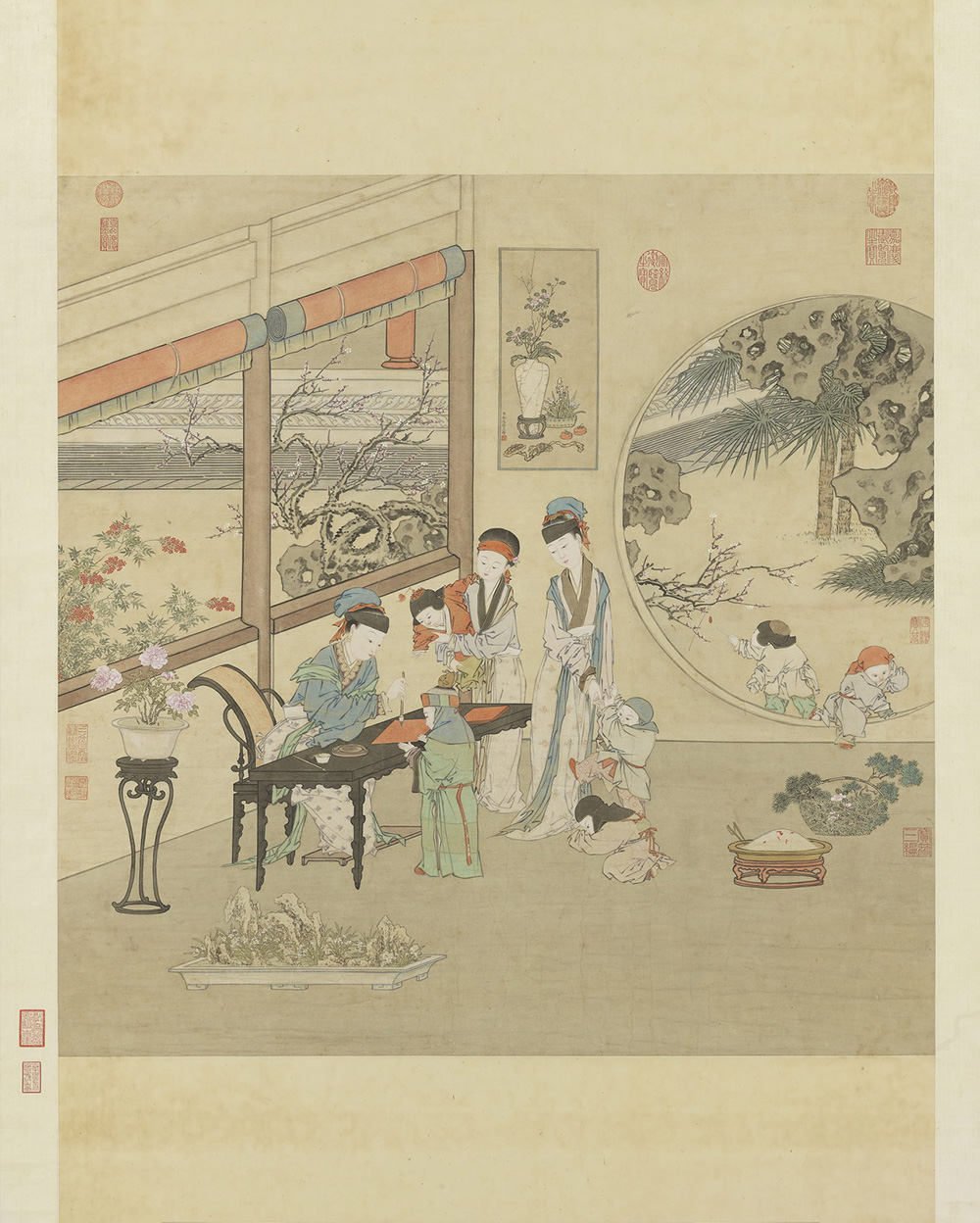 描绘东汉班昭援笔授书之故事。班昭案前执笔,二女携幼儿旁观,除了面对班昭的华服小儿肃立桌前之外,其他的五个孩童或努力想自侍女手中挣脱,或自顾自地捣蛋调皮。透过方形窗格与圆形洞门所见到的户外园景,使画面更增空间深度,室内之牡丹,水仙、与阁外的白梅、天竺相互争艳,益添活泼轻快的气氛。