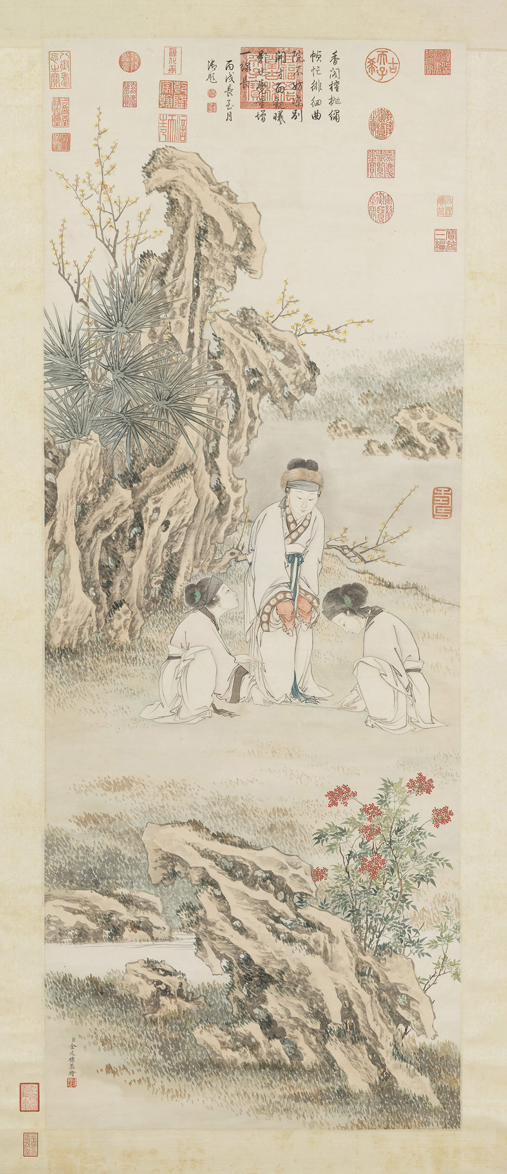 自跋:臣金廷标恭绘。 赏鉴跋: 本幅: 香阁权抛绣帧忙。徘徊曲院不妨凉。别开生面观曦影。也觉量増一线长。丙戌(1766年)长玉月御题。(印记:干、隆)