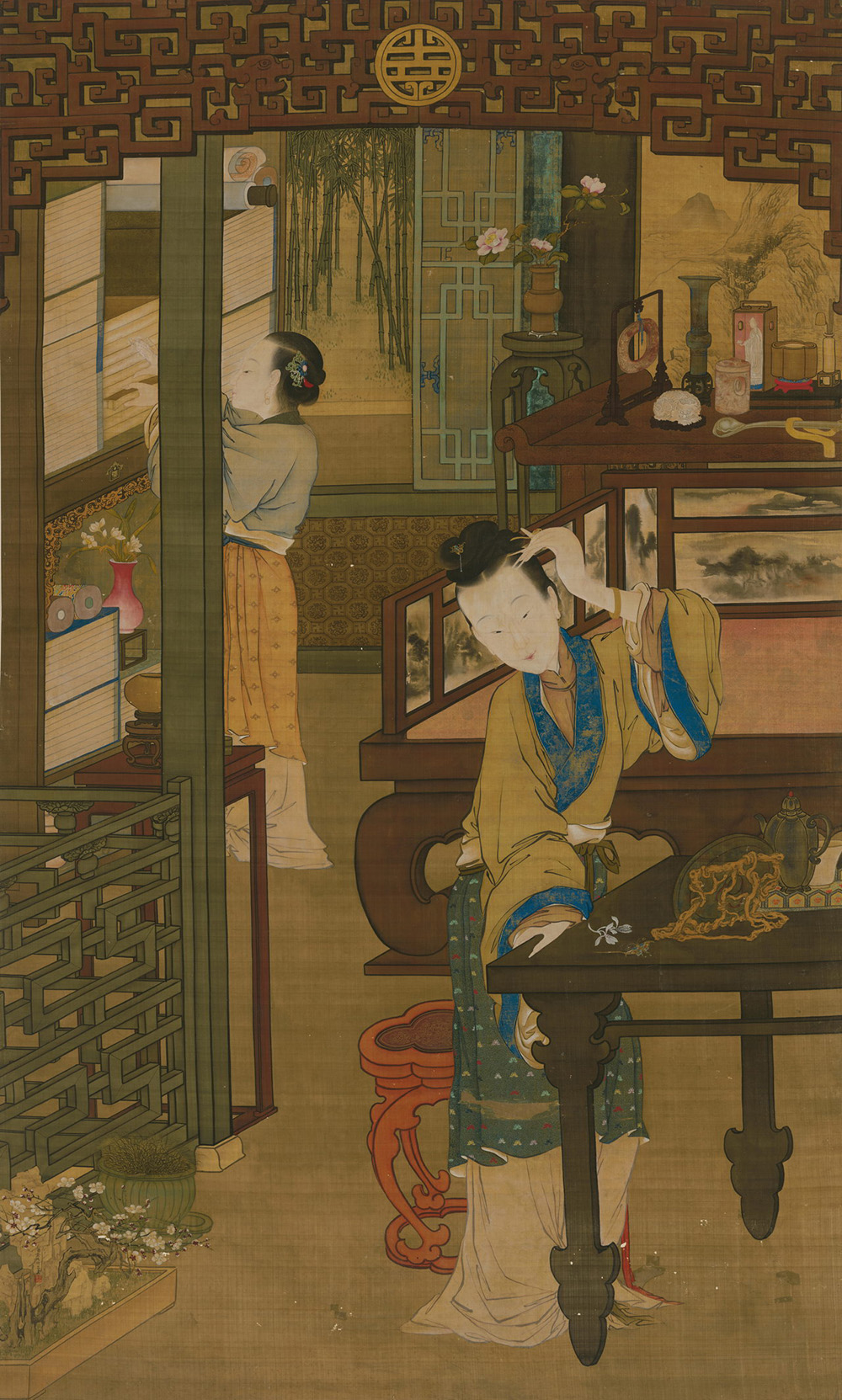 图中由精致家具、富丽陈设所构筑出典雅高贵的环境表明,此图描绘的正是宫廷女子日常生活的景象。