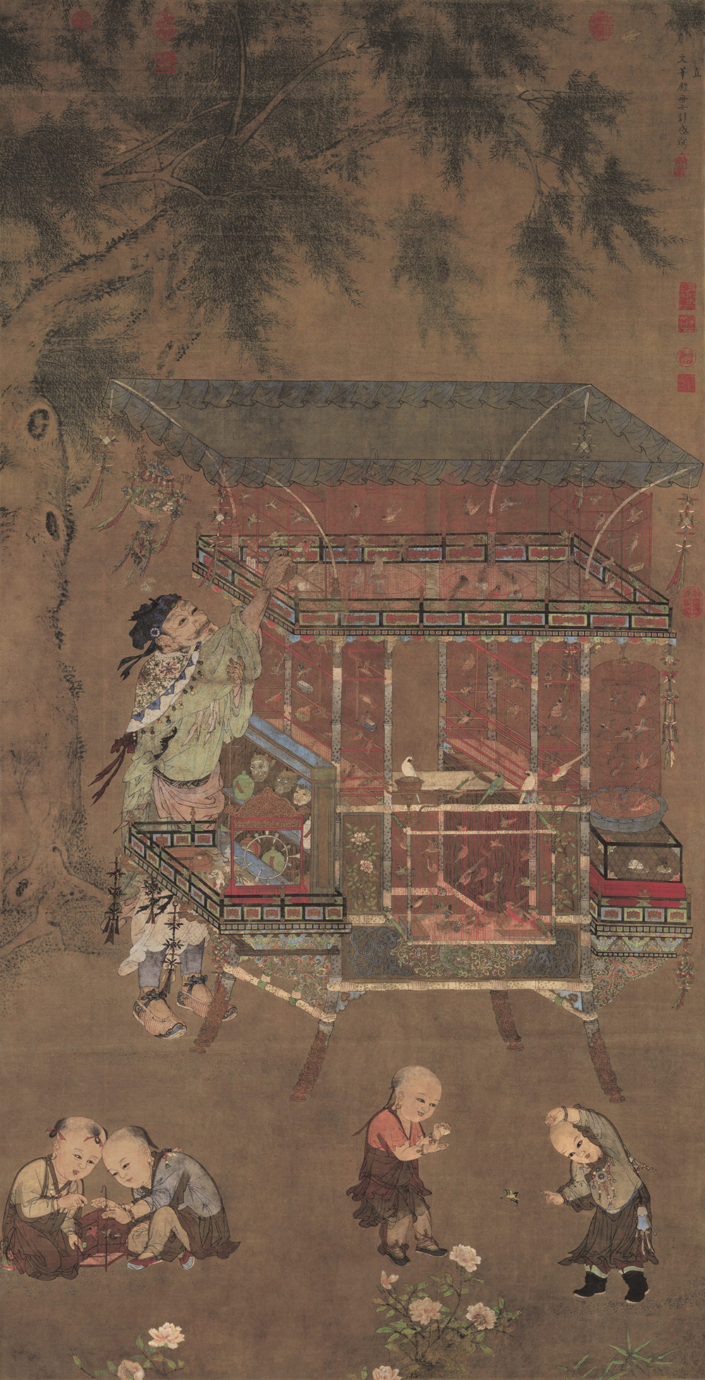 款署:“直文华殿画士计盛写。”钤“金门画士”印。“货郎图”属于风俗画,这一题材自宋代以来就十分流行。画面中货郎衣着整洁,儿童服饰华丽,货架上的各类物品丰富而精致。画法上刻画细腻,设色浓艳,已将宋人民间货郎图中的生活气息转化为宫廷贵族气息,因而又有“宫廷货郎”之称。