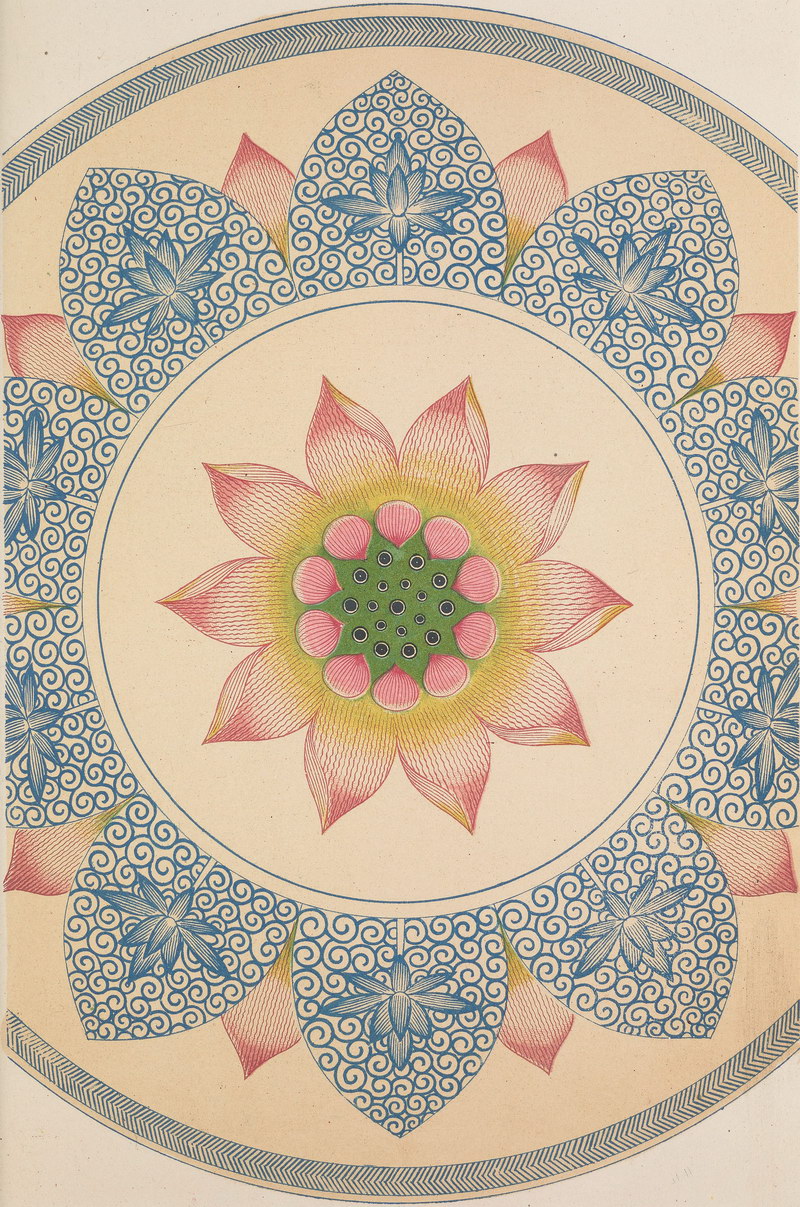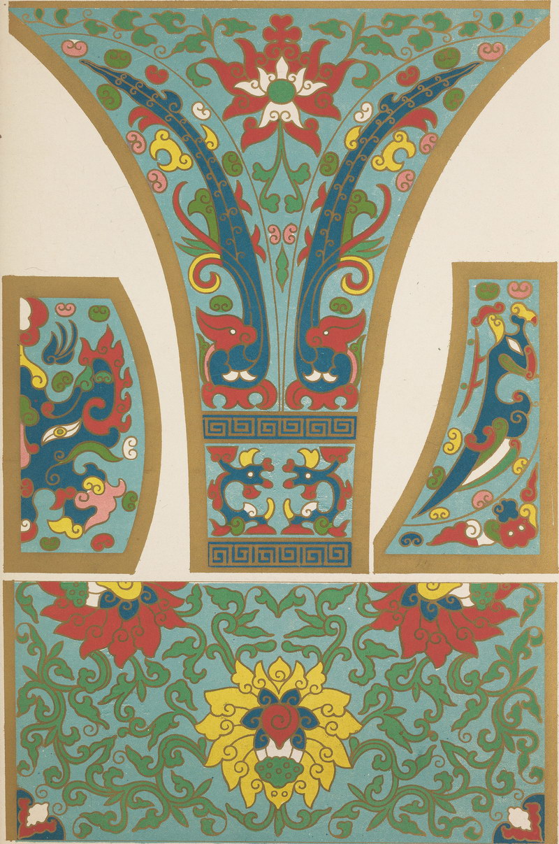 Examples of Chinese ornament,By Jones Owen《中国纹样集锦》是英国当时先锋建筑家与设计师Owen Jones根据历史上的The South Kensington museum/南肯辛顿博物馆(现为英国自然史博物馆)部分中国收藏品和部分其它中国古董图案绘制而成。从书中选取的图案看,这些工艺作品皆似晚清粉彩或珐琅彩。这类作品固有Owen Jones称的“富丽”与 “精细”,但图案呆板,无即兴之趣,色彩肥腻,失淡雅之美。为了避免于此,Owen Jones选图尽量避免了过于浓艳的图案,他选择了一些颇有唐宋之风,如不同式样的缠枝莲,即保留原有风格又未失淡雅和即兴的唐宋之典型;再则其纹样的色值,皆比原图案淡;弱化了原图案“大红大紫”的肥腻,成一种“再创作”的佳范。该书堪称东方与西方审美的完美结合。