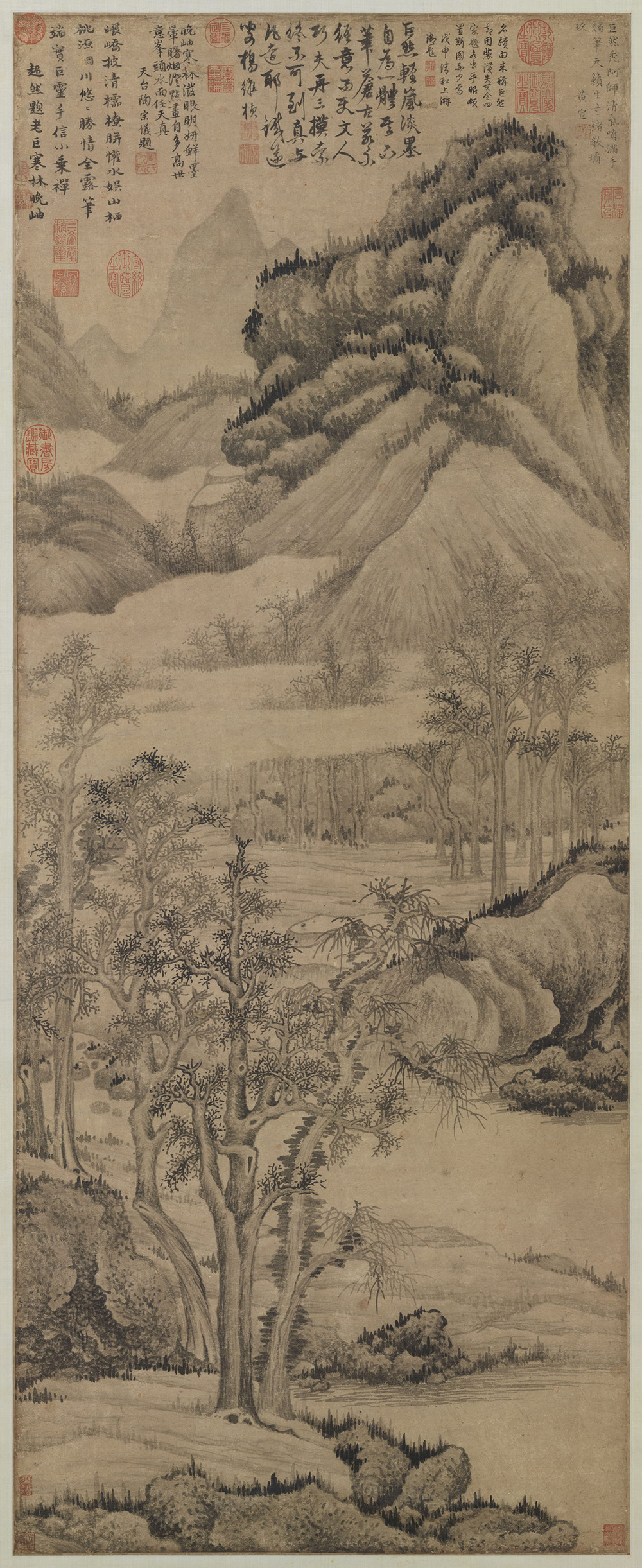 本幅画群山溪壑,林树弥望,山石皴纹多以湿笔染破,明晦隐现,轮廓模糊,特饶山野烟雾之致。本幅无作者款印,依据旧籤,定为巨然之作。